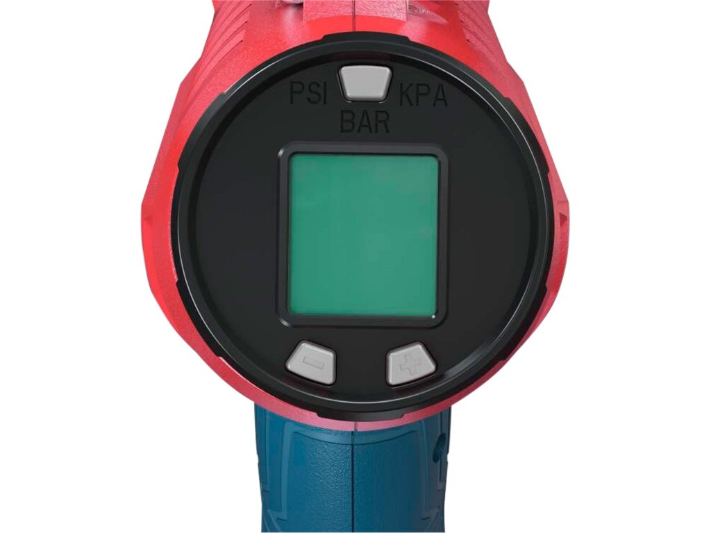 Displej je podsvícený, což usnadňuje práci v šeru nebo ve tmě. Integrovaná LED svítilna může svítit i nezávisle na běhu kompresoru, což je praktické například při nouzovém dofukování pneumatik na cestách. Spínač je vybaven pojistkou proti samovolnému spuštění a zámkem pro aretaci v poloze zapnuto, což zvyšuje bezpečnost a komfort při práci.