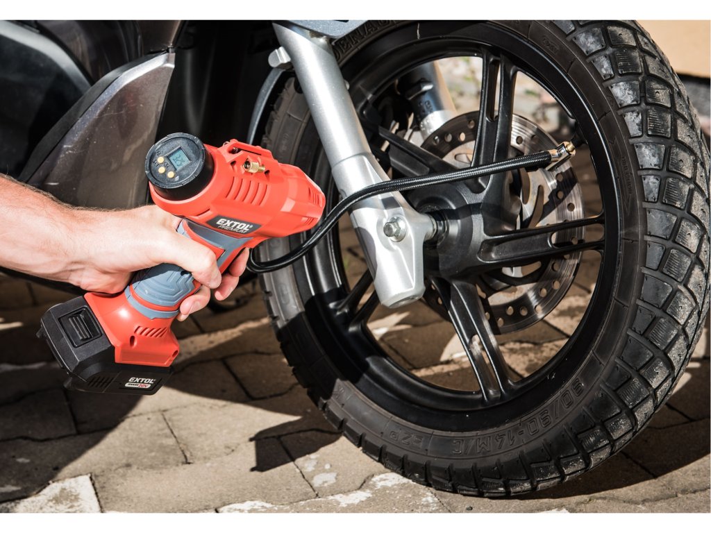 Aku domácí kompresor 2,0Ah 20V EXTOL PREMIUM SHARE 8891874 je výkonný plnící kompresor určený ke kontrole a doplňování tlaku v pneumatikách osobních a užitkových automobilů, motocyklů i jízdních kol. Díky dodávanému příslušenství je vhodný také pro nafukování sportovních míčů, lehátek, matrací a dalších nafukovacích předmětů.