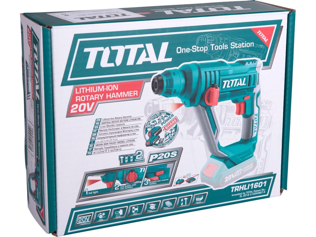 Kladivo je vybaveno ergonomickou rukojetí pro pohodlné a bezpečné ovládání, bezpečnostní spojkou pro ochranu uživatele při zaseknutí vrtáku a kompaktní konstrukcí pro snadnou manipulaci i při delší práci. Dodávka je bez baterie a nabíječky, což umožňuje použít již existující 20 V akumulátor Total.