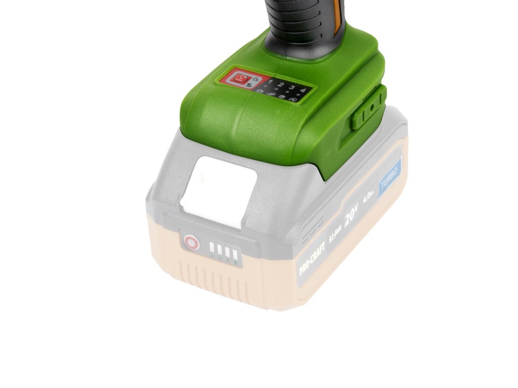 Baterie a nabíječka nejsou součástí balení. Utahovák je kompatibilní s univerzální 20V baterií Procraft, kterou lze využít i pro další nástroje této řady.