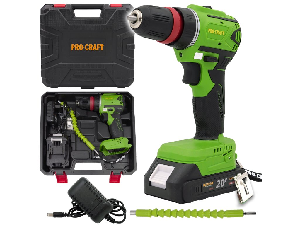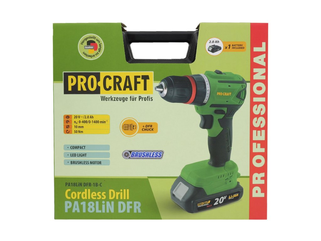 Aku šroubovák Procraft PA18LiN DFR je poloprofesionální praktický pomocník pro použití všude tam, kde při vrtání a šroubování nechcete být omezováni přívodním kabelem. Šroubovák s možností změny směru otáček pravý/levý chod a utahováním momentem až 50Nm je vhodný ke šroubování vrutů, matic a šroubů s použitím 1/4» nástavců - bitů. Možnost nastavení utahovacího momentu ve 20 stupních. Rychloupínací sklíčidlo umožňuje upnutí vrtáků a stopkových nástrojů do průměru 13mm. Šroubování na 1. a vrtání na 2. rychlostní stupeň lze provádět s plynulou regulací otáček. Pro zvýšení pracovního komfortu a stability je stroj vybaven přídavnou rukojetí a integrovaným LED osvětlením pracovní plochy s funkcí dosvitu. Součástí dodávky je transportní plastový kufr, baterie 20V 2Ah, nabíječka, ohebná hřídel.