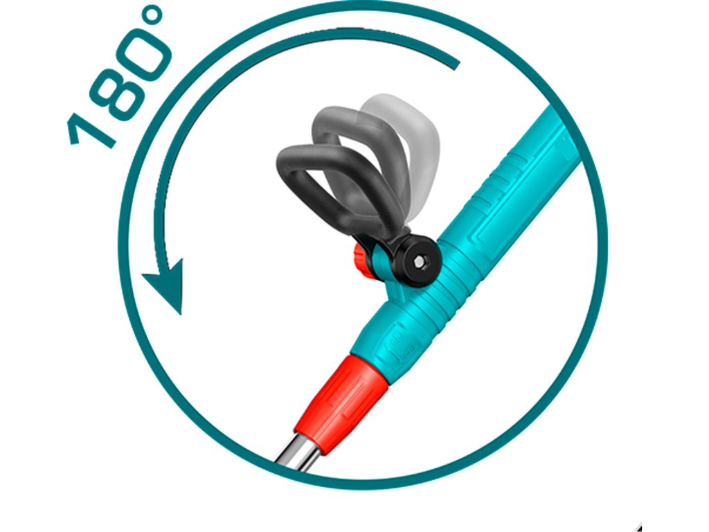 Hlava sekačky je polohovatelná a otočná o 180°, což usnadňuje práci v úzkých a obtížně přístupných místech. Teleskopická rukojeť umožňuje přizpůsobit délku sekačky výšce uživatele pro pohodlné ovládání. Pogumovaná rukojeť tlumí vibrace a zajišťuje bezpečný a jistý úchop při práci.