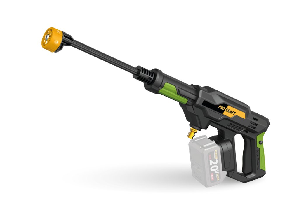 Ergonomická rukojeť umožňuje pohodlné ovládání, rychlospojky zajišťují snadné připojení příslušenství a kompaktní rozměry umožňují snadnou manipulaci i skladování. Myčka je součástí aku systému Procraft 20 V.