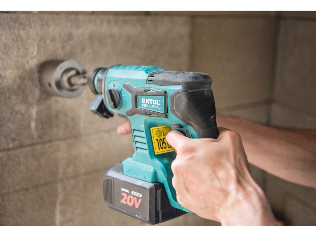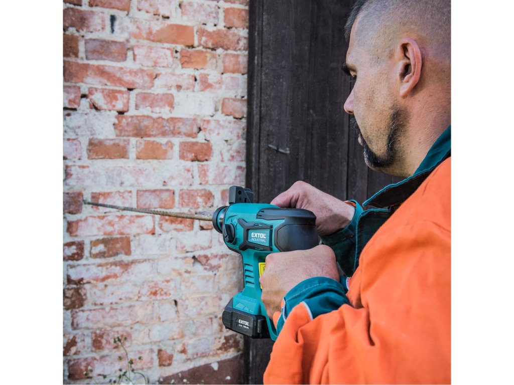 Kladivo je vybaveno ergonomickou rukojetí pro pohodlné a bezpečné ovládání, bezpečnostní spojkou pro ochranu uživatele při zaseknutí vrtáku a kompaktní konstrukcí pro snadnou manipulaci i při delší práci. Dodávka je bez baterie a nabíječky, takže je možné využít již existující 20 V akumulátor Extol Industrial.