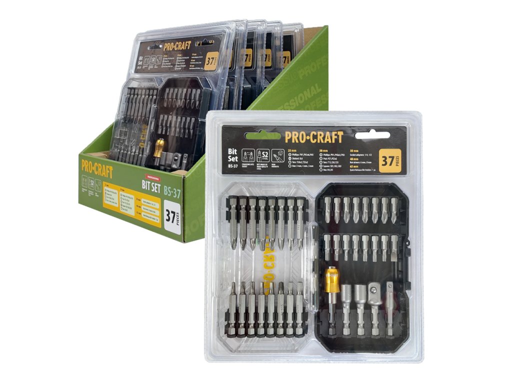 Sada bitů BS-37 v balení: 37 kvalitních bitů pro šroubování všech běžných typů spojů. 37dílná sada bitů Procraft BS-37 16 ks 25mm bitů: Phillips: PH1, PH2x6, PH, Ploche: SL6, Torx: T20x2, T25x2, Imbus: 3mm, 4mm, 5mm 16 ks 50mm bitů: Phillips: PH1, PH2x3, PH3, Pozi: PZ1, PZ2x2, Torx: T15, T20, T25, Square: SQ1, SQ2, SQ3, Imbus: H4, H5.