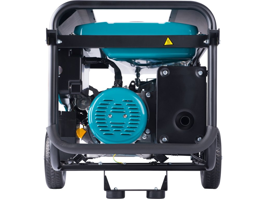 Srdcem stroje je osvědčený čtyřtaktní motor s nízkou spotřebou paliva (min. 0,45 l/kWh), který ve spojení s velkokapacitní 25l nádrží umožňuje až 13 hodin nepřetržitého provozu. Tato vysoká míra autonomie je zásadní při práci v odlehlých oblastech nebo při dlouhotrvajících výpadcích elektrické sítě. Robustní ocelový rám chrání vnitřní komponenty před mechanickým poškozením, zatímco dodávaný podvozek s odolnými koly a ergonomicky tvarovaná rukojeť umožňují snadnou manipulaci se strojem o hmotnosti 87,2 kg. Nová konstrukce madla dovoluje plynulé vedení centrály jednou rukou i v nerovném terénu stavenišť. Bezpečnost provozu dále zvyšuje olejové čidlo, které při poklesu hladiny maziva automaticky odstaví motor, a jističe chránící elektrické výstupy před přetížením.