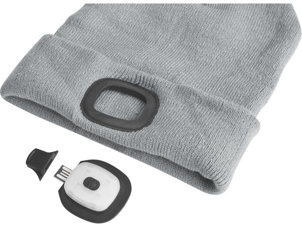 čepice s čelovkou 4x45lm, USB nabíjení, šedá, univerzální velikost, 73% acryl a 27% polyester
