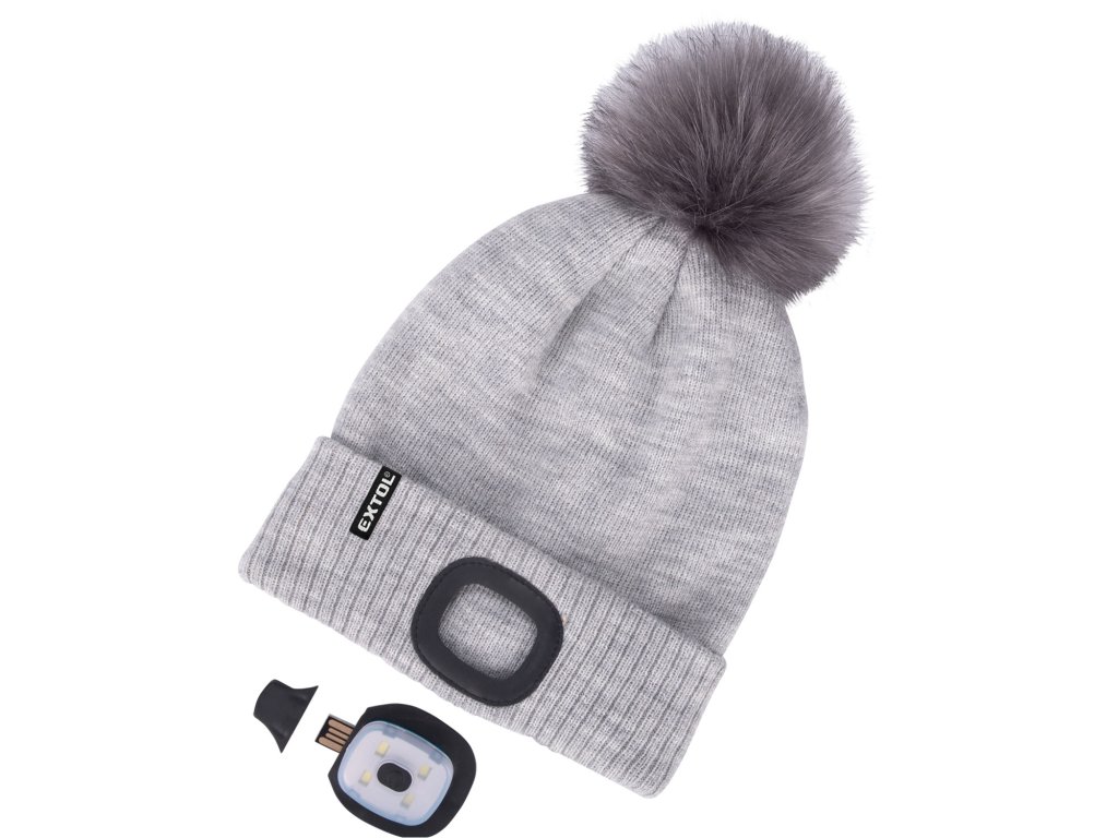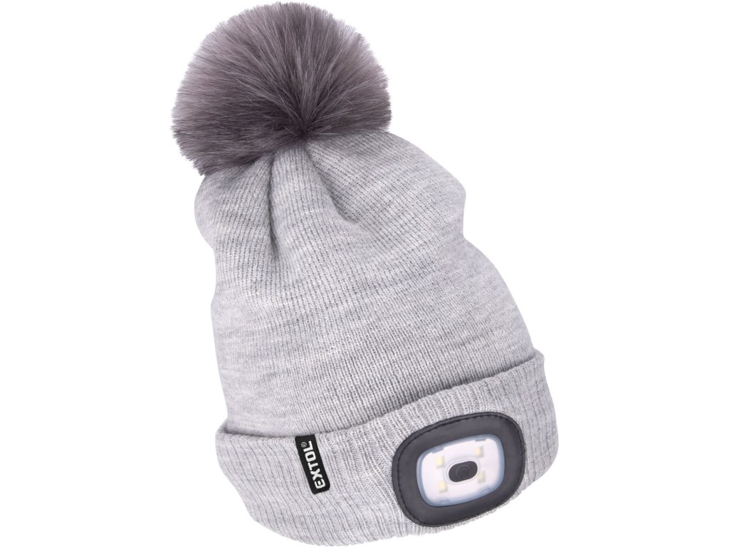čepice s čelovkou 4x45lm, USB nabíjení, světle šedá s bambulí, univerzální velikost, 100% acryl