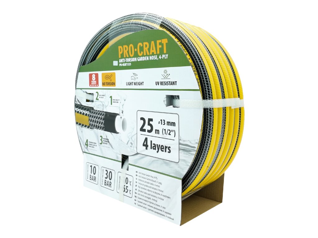 Černo-žlutá zahradní hadicí Procraft PR-4KAT1325 je zkrátka spolehlivým a odolným pomocníkem pro každého zahrádkáře, který ocení dlouhou životnost a bezstarostné používání.