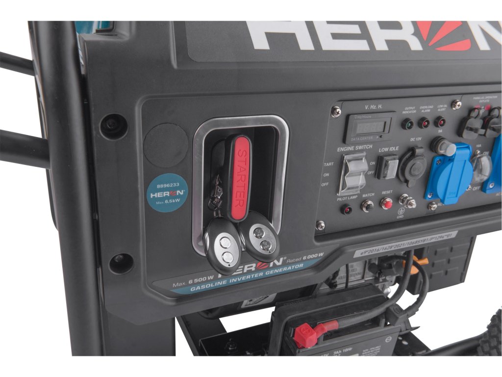 HERON 8896233 je technologicky vyspělé zařízení konstruované pro nejnáročnější profesionální aplikace, kde je vyžadována stabilita napětí srovnatelná s veřejnou sítí. Srdcem stroje je silný čtyřtaktní motor o objemu 320 cm³, který pohání digitálně řízený invertor. Tento systém transformuje elektrickou energii s vysokou frekvencí a následně ji precizně vyhlazuje, čímž eliminuje jakékoli harmonické zkreslení. Na ovládacím panelu se nachází multifunkční digitální displej, který v reálném čase zobrazuje klíčové parametry: napětí (V), frekvenci (Hz) a celkový počet odpracovaných motohodin (Mth). Tato diagnostika je klíčová pro včasné plánování servisních intervalů a zajištění maximální životnosti soustrojí.