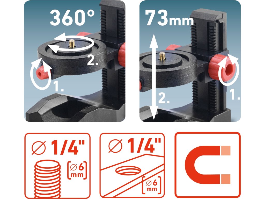 › Stavba › Vodováhy, stahovací latě, lasery › Lasery › držák-stativ nastavitelý, magnetický na laser/kameru, 1/4" šroub