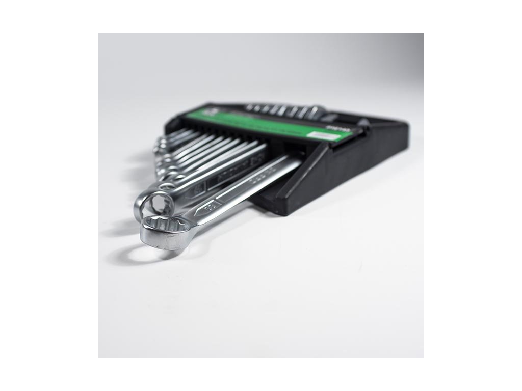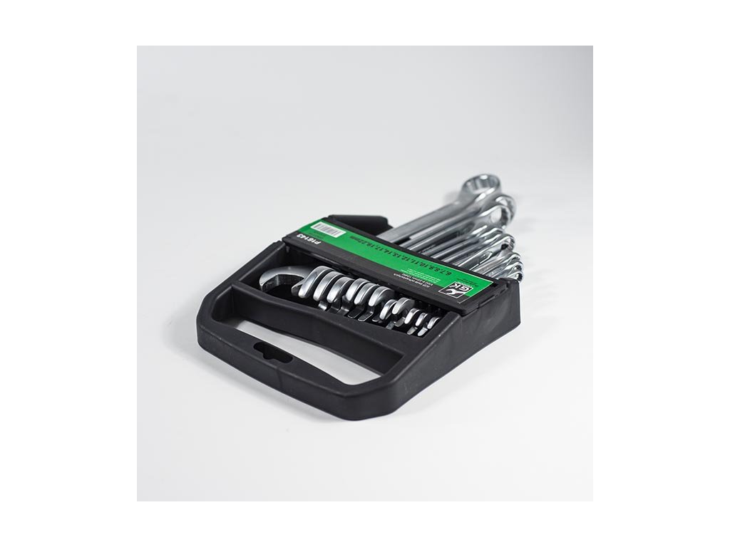 Sada očkoplochých klíčů je uložena v plastovém držáku. Klíče jsou z jedné strany ploché otevřené, ze strany druhé je dvanáctihranné očko.