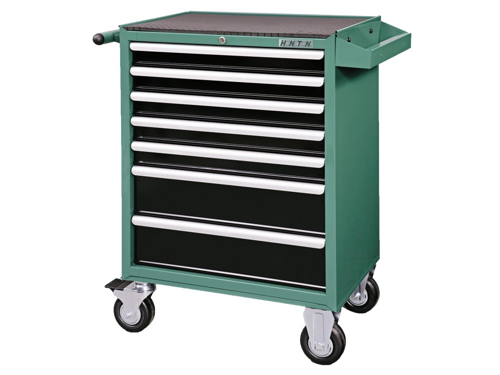 Kovový montážní vozík na nářadí se 7 zásuvkami. Dvě pevná a dvě otočná kolečka s poziční brzdou. Zásuvky na kuličkových ložiskách lze vysunout do 40cm. horní pracovní plocha i zásuvky jsou vypodloženy protiskluzovou podložkou. Součástí jsou uzamykatelné zásuvky. Má 5 nízkých a 2 vysoké zásuvky.