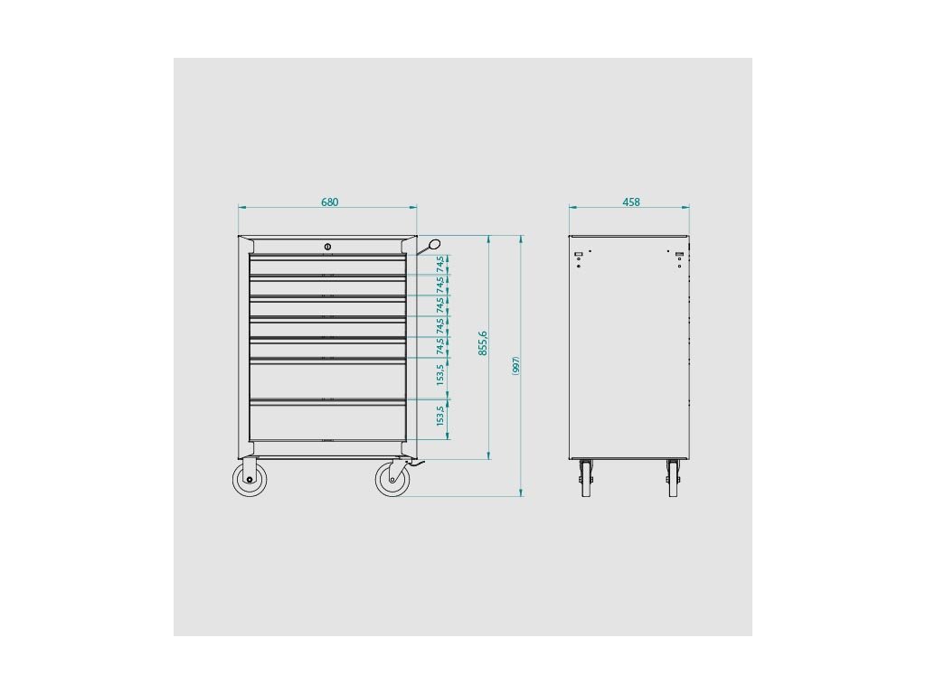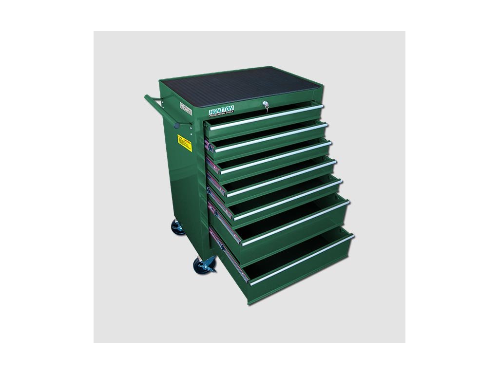 Kovový montážní vozík na nářadí se 7 zásuvkami. Má dvě pevná a dvě otočná kolečka s pozičníbrzdou. Zásuvky na kuličkových ložiskách lze vysunout 40cm. Horní pracovní plocha i zásuvky jsou vypodloženyprotiskluzovou podložkou. Držadlo pro manipulaci s vozíkem lze umístit z pravé nebo levé strany.Součástí jsou uzamykatelné zásuvky (5 nízkých a 2 vysoké zásuvky).
