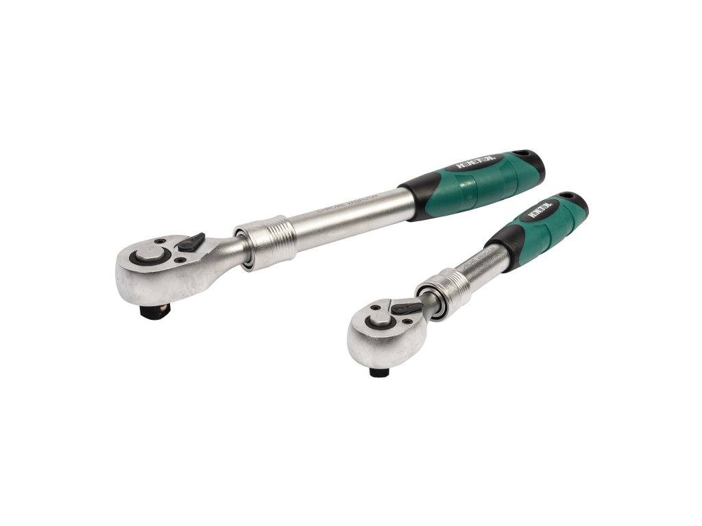 Ráčna teleskopická s pogumovanou rukojetí, kterou lze pomocí uvolnění aretace prodloužit cca o 100mm a tím zvýšit pákový efekt při utahování.