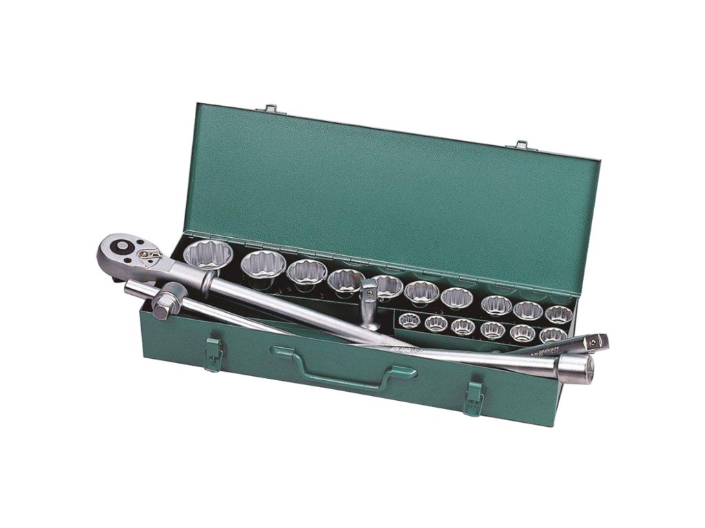 Kompletní sada 12-hranných hlavic 3/4" s veškerým příslušenstvím pro profesionální i domácí použití, dodávaná v odolném kovovém boxu pro přehledné uskladnění.