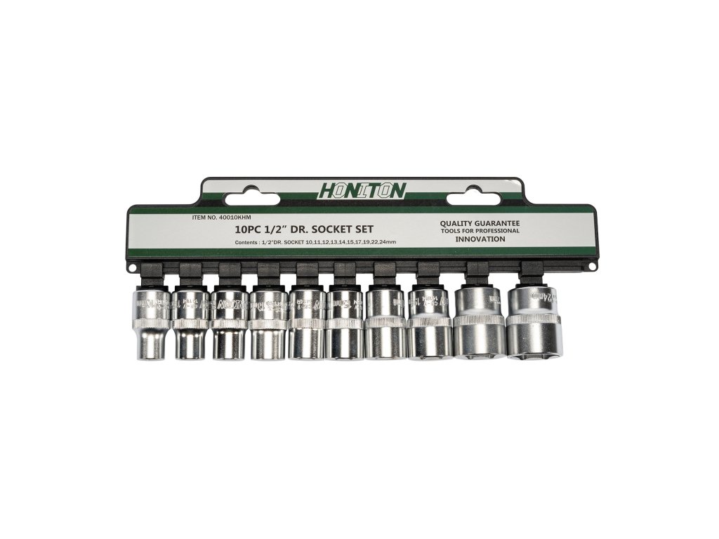 Praktická sada hlavic 1/2" pro běžné použití, dodávaná s plastovým nebo kovovým držákem pro přehledné uskladnění.