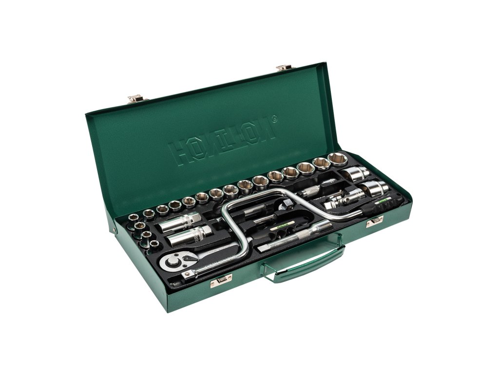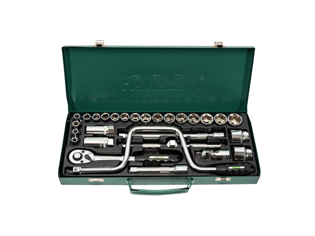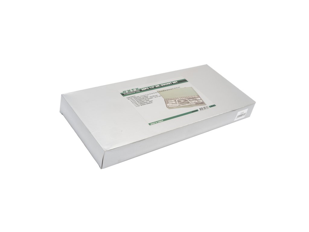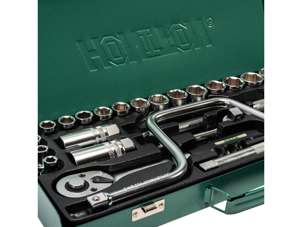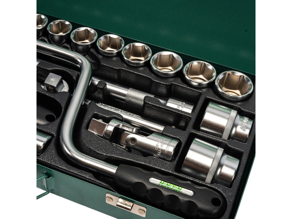Profesionální sada hlavic 1/2" s kompletním příslušenstvím, dodávaná v odolném kovovém boxu pro bezpečné a přehledné uskladnění.