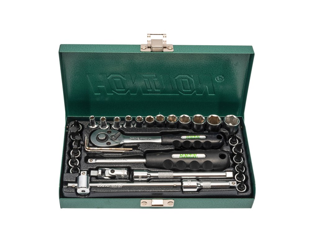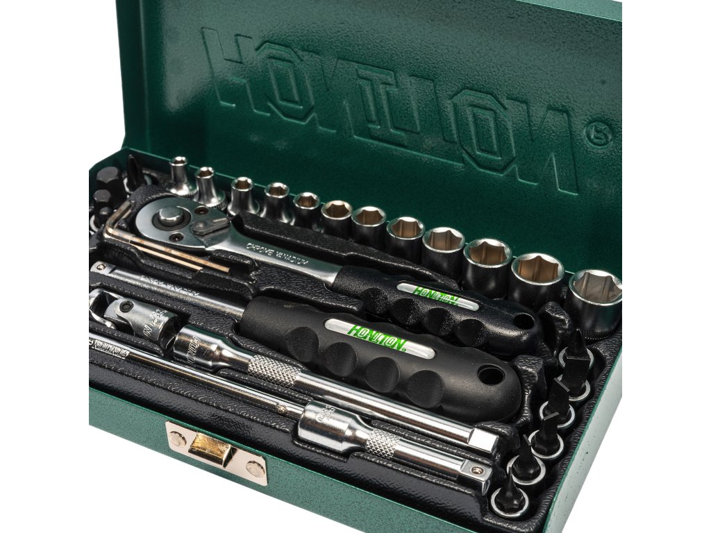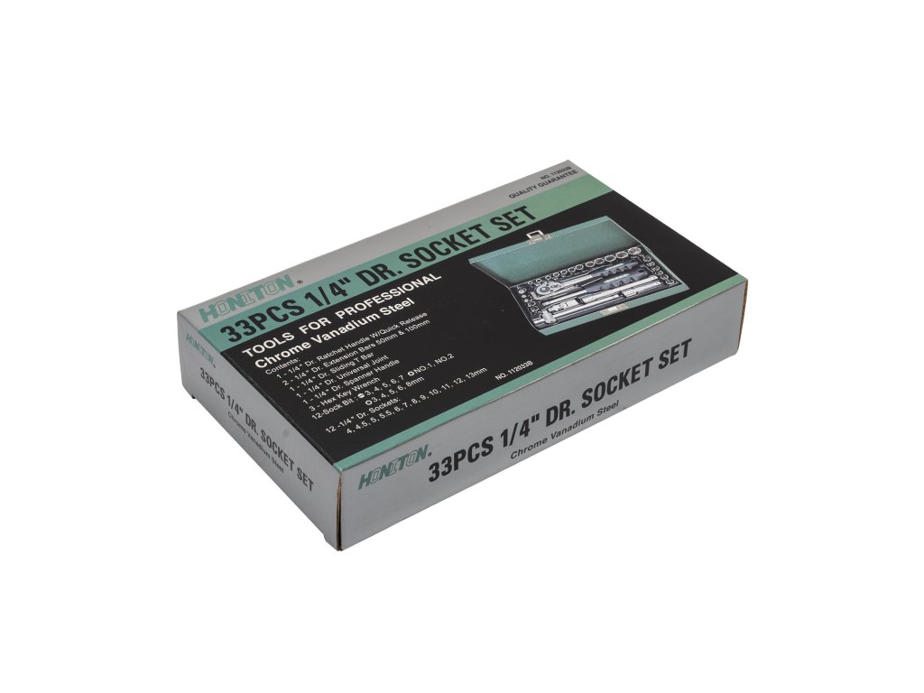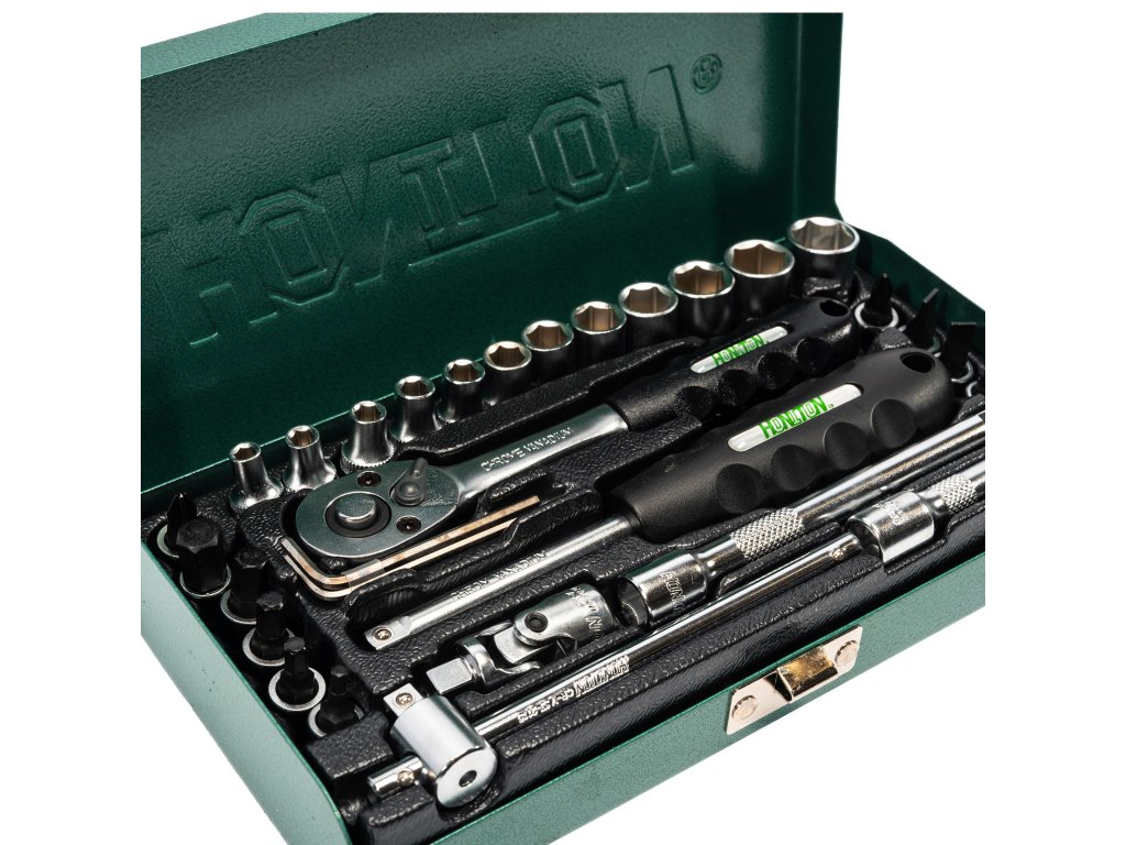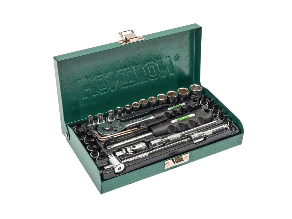 Praktická sada hlavic 1/4" s kompletním příslušenstvím pro domácí i profesionální použití. Dodávána s kovovým boxem pro bezpečné a přehledné uskladnění.