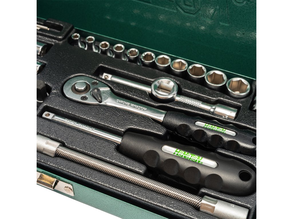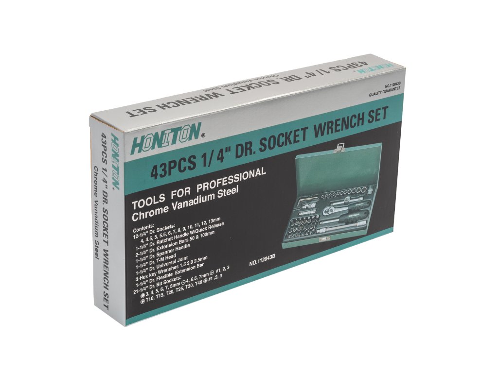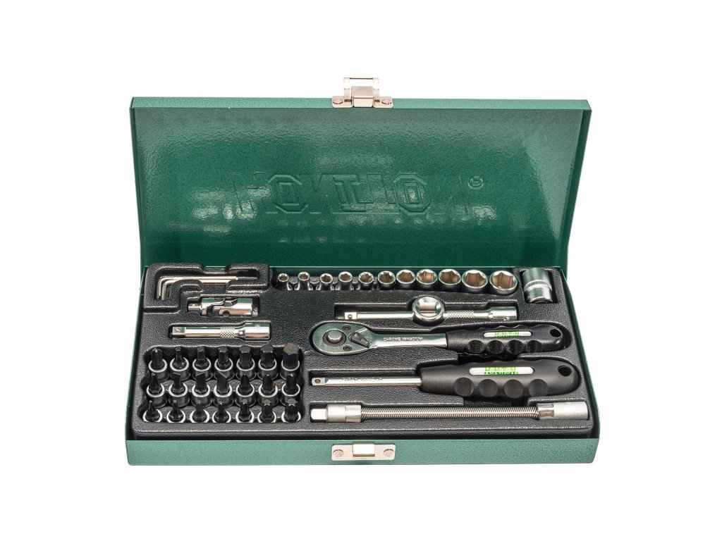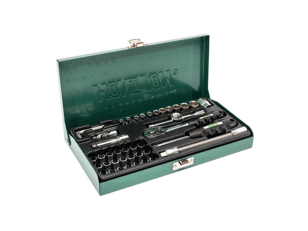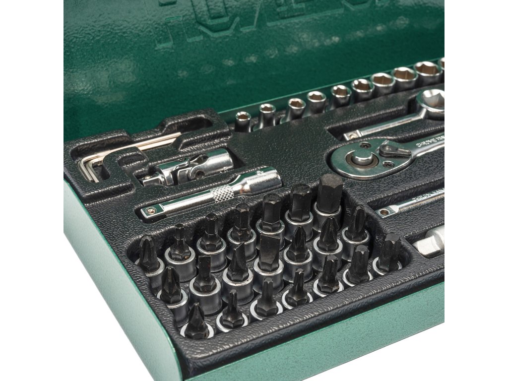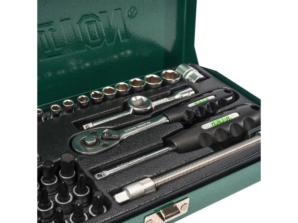 Všestranná sada hlavic 1/4" s kompletním příslušenstvím pro profesionální i domácí použití, dodávaná s praktickým kovovým boxem pro bezpečné a přehledné uskladnění.
