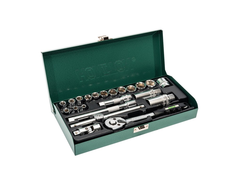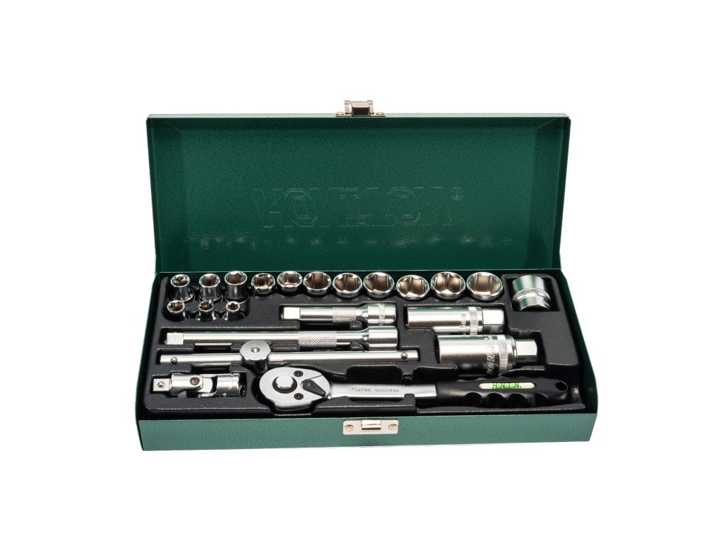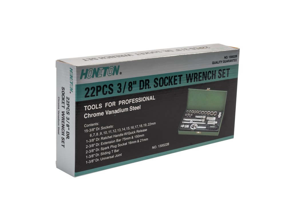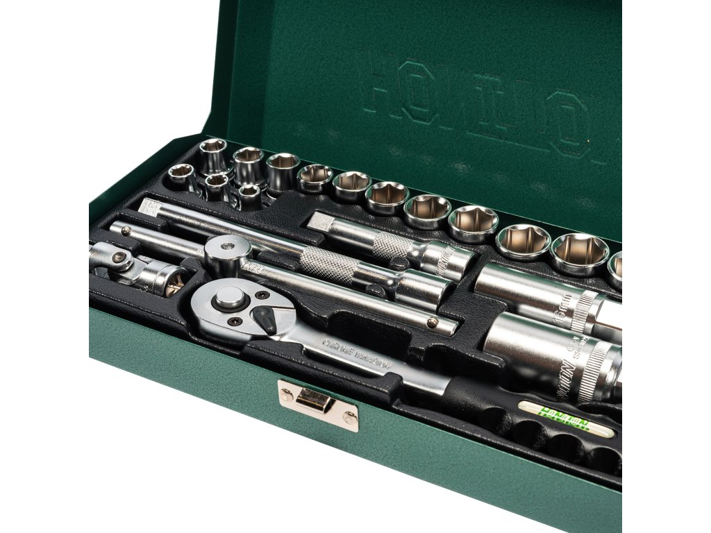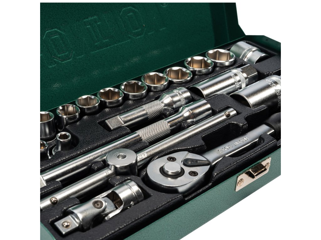 Univerzální sada hlavic 3/8" s kovovým boxem pro bezpečné a přehledné uskladnění. Vhodná pro profesionální dílny i domácí použití, vybavená kompletním příslušenstvím pro práci se šrouby, maticemi i svíčkami.