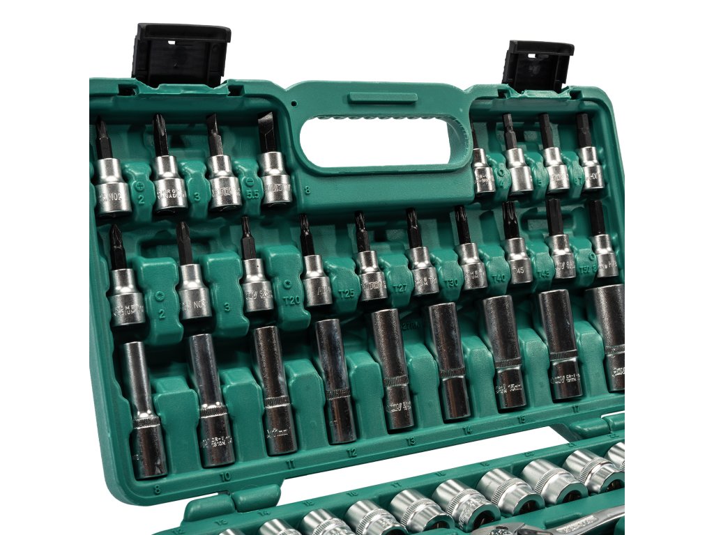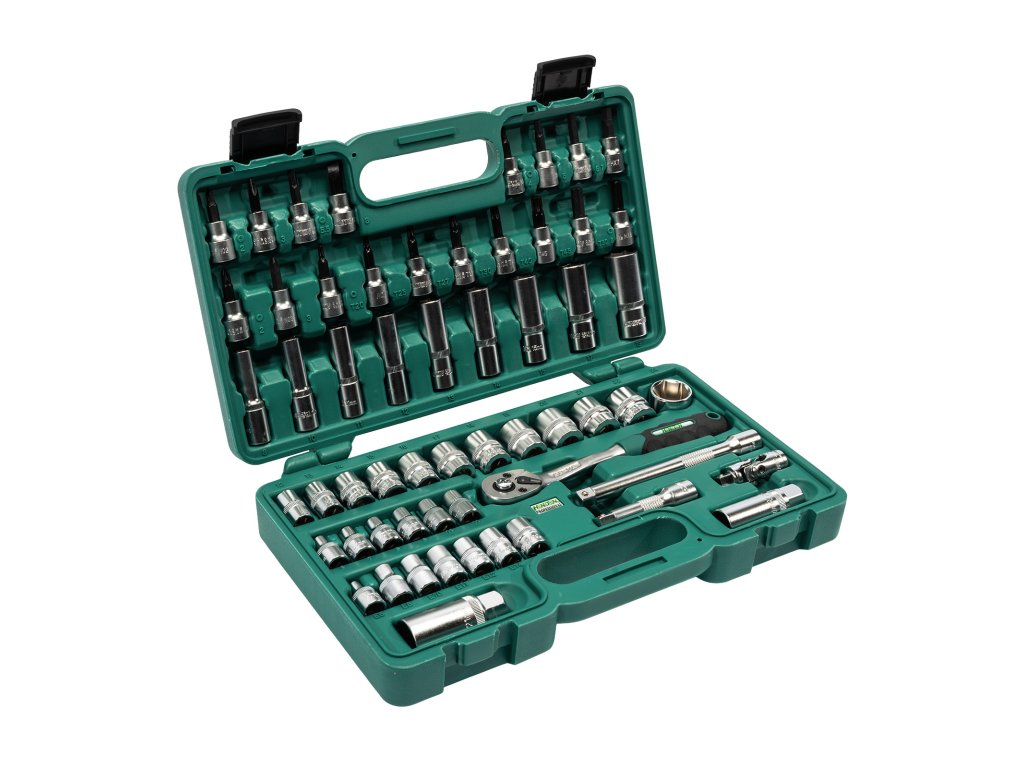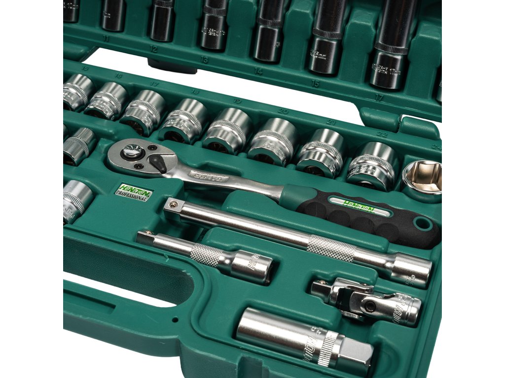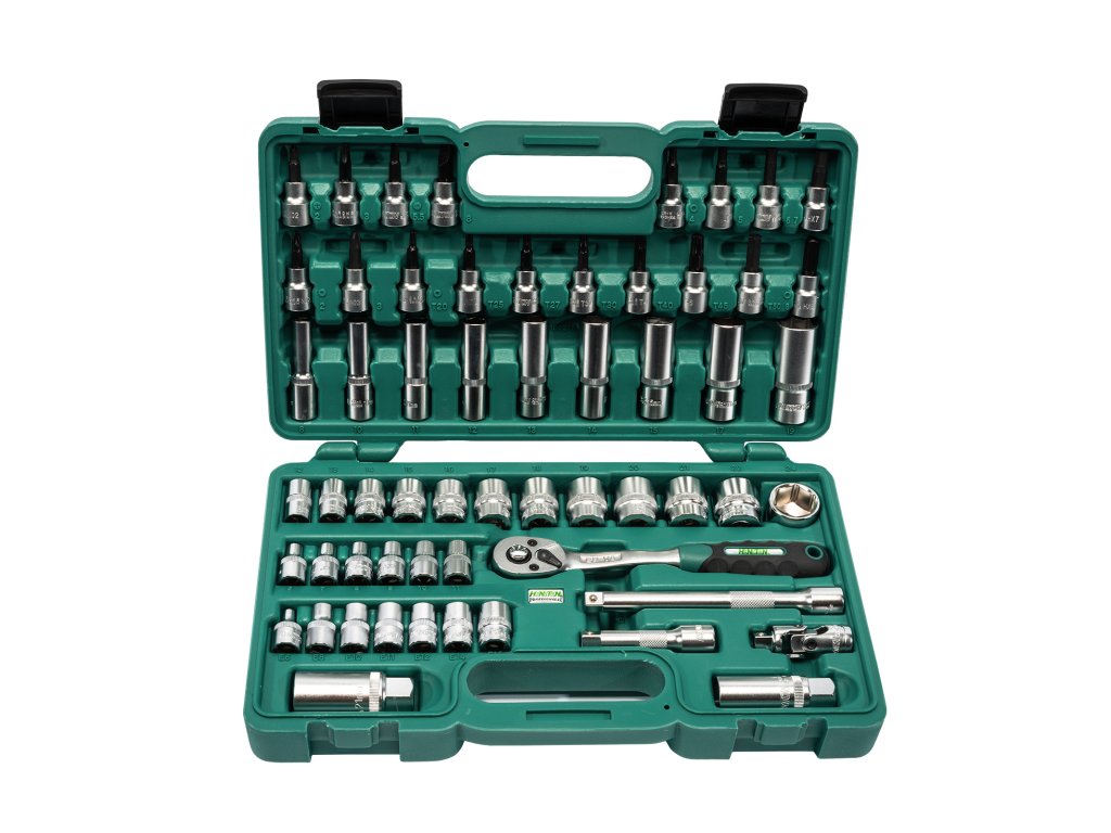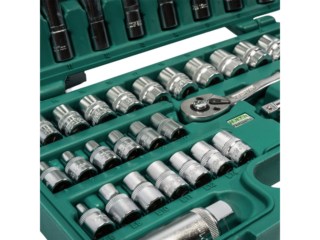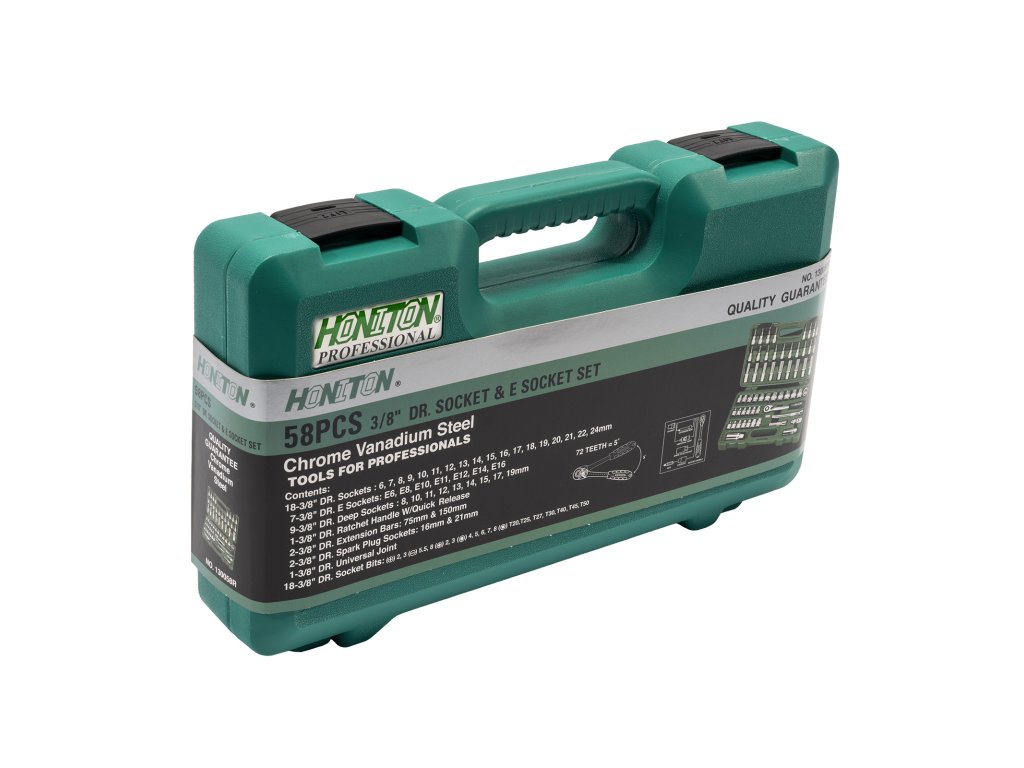 Profesionální sada hlavic HONITON s upnutím 3/8" obsahující 58 dílů. Vhodná pro autoservisy, dílny i domácí použití. Hlavice a příslušenství jsou vyrobeny z Cr-V oceli, uložené v pevném plastovém kufru pro snadný přehled a transport.