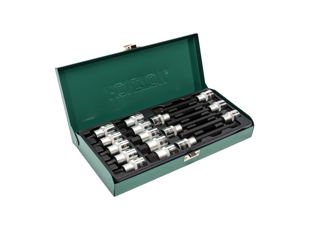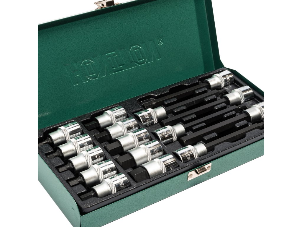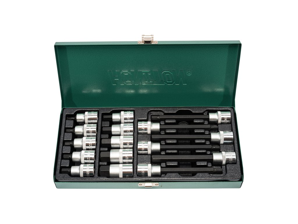 Sada 16 zástrčných imbusových hlavic 1/2" ve dvou délkách (55 mm a 140 mm). Vhodné pro práci v dílně i profesionální použití, s dlouhou životností a přesným zpracováním.
