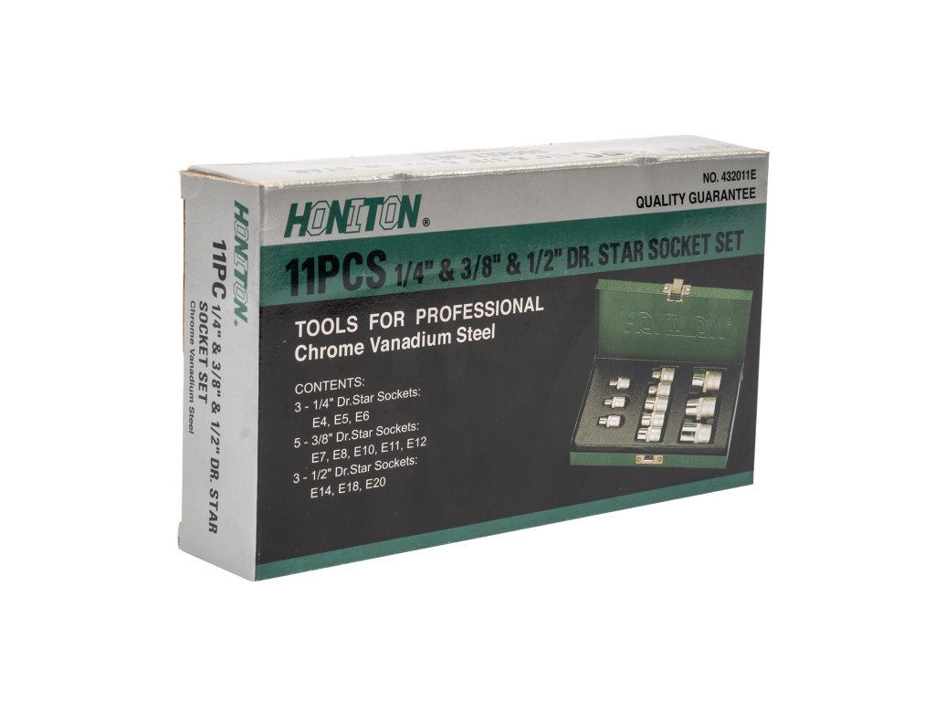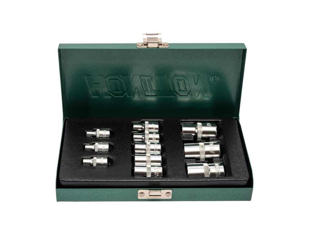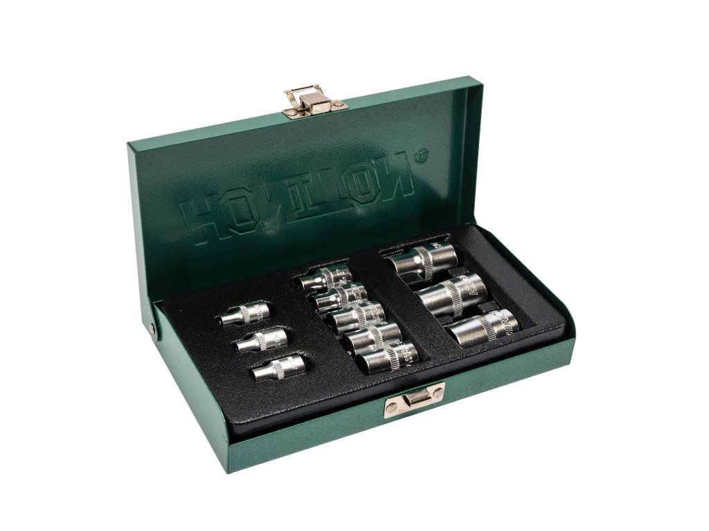 Sada 11 nástrčných hlavic TRX-E v provedení 1/4", 3/8" a 1/2". Praktické uspořádání v kovovém boxu, vhodné pro profesionální i hobby použití.
