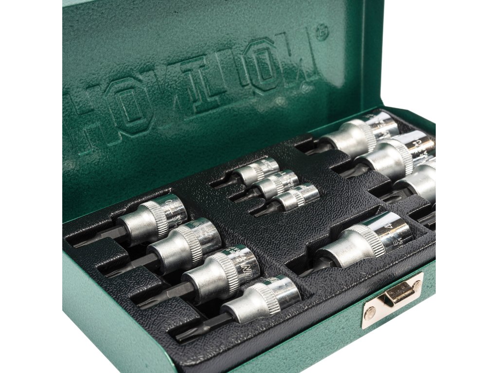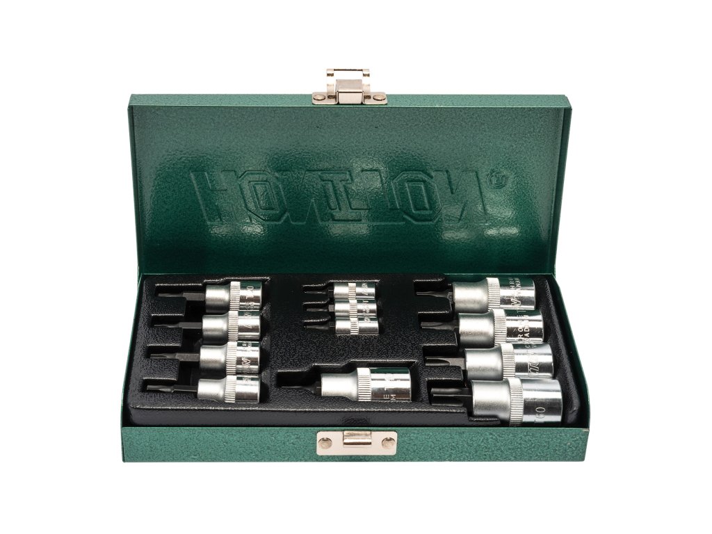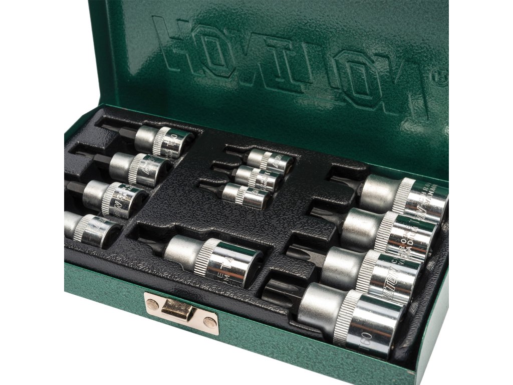 Sada 16 zástrčných hlavic TRX v provedení 1/4", 3/8" a 1/2". Dodáváno v praktickém kovovém boxu pro přehledné uložení, vhodné pro profesionální i domácí použití.