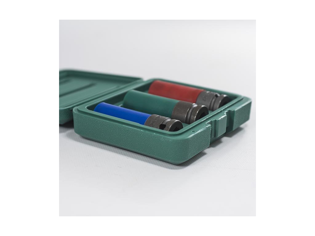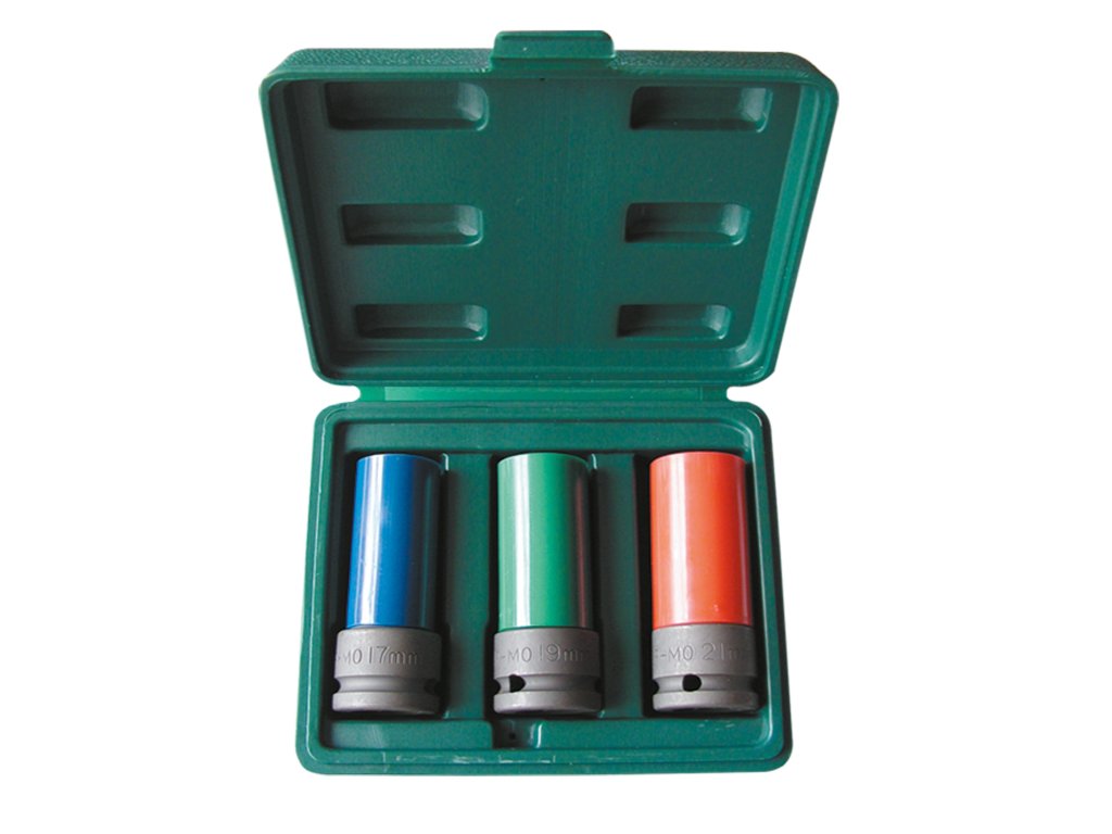 Sada obsahuje tři klíčové rozměry: 17 mm, 19 mm a 21 mm, které patří mezi nejčastěji používané při práci s kolovými šrouby. Prodloužené tělo hlavic (cca 85 mm) umožňuje snadný přístup i do hůře dostupných míst. Povrch hlavic je chráněn plastovým krytem, který lze v případě potřeby sejmout a který zabraňuje poškrábání alu disků.