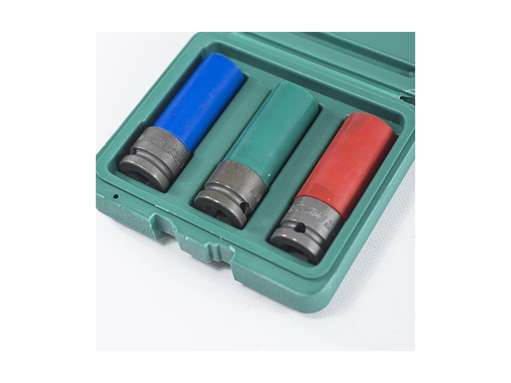 Profesionální sada HONITON H1803 obsahuje tři nejpoužívanější rozměry rázových hlavic 1/2″ určených především pro montáž a demontáž kol automobilů, včetně hliníkových disků. Díky prodlouženému provedení a plastovému ochrannému nástřiku je práce bezpečná, rychlá a bez rizika poškození povrchu disků.