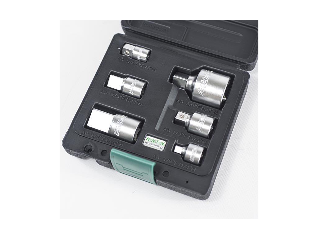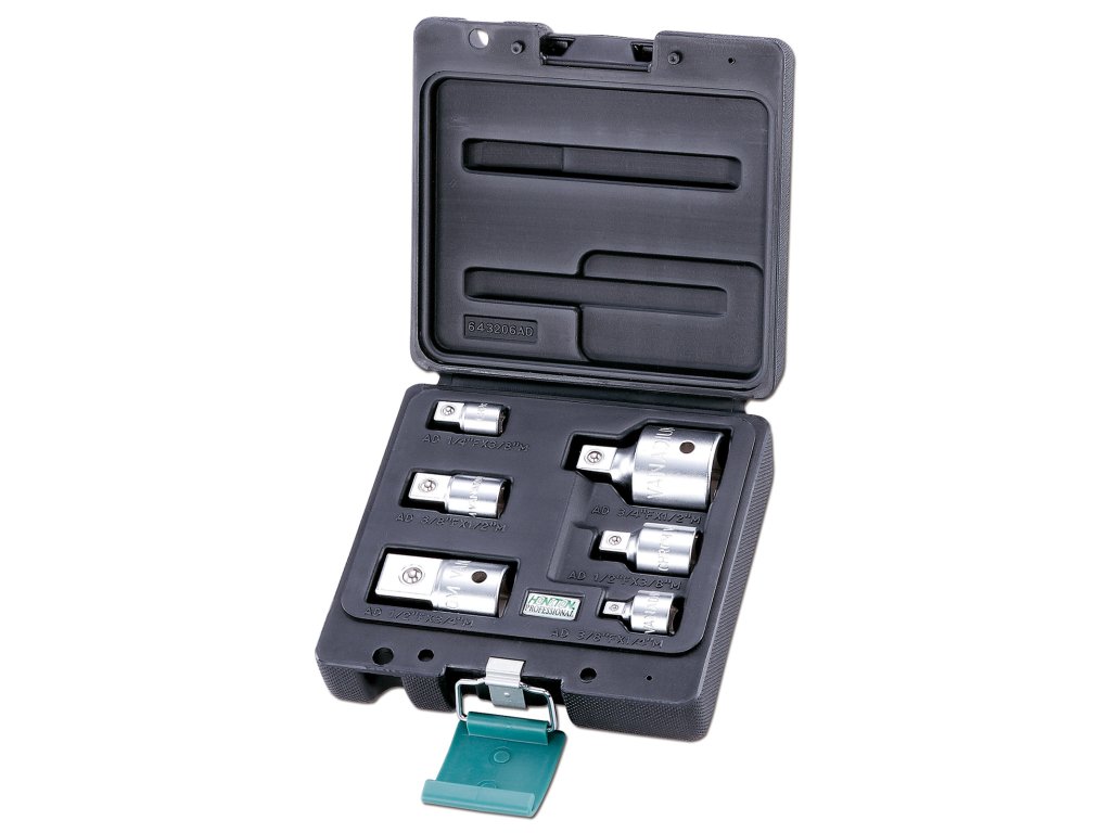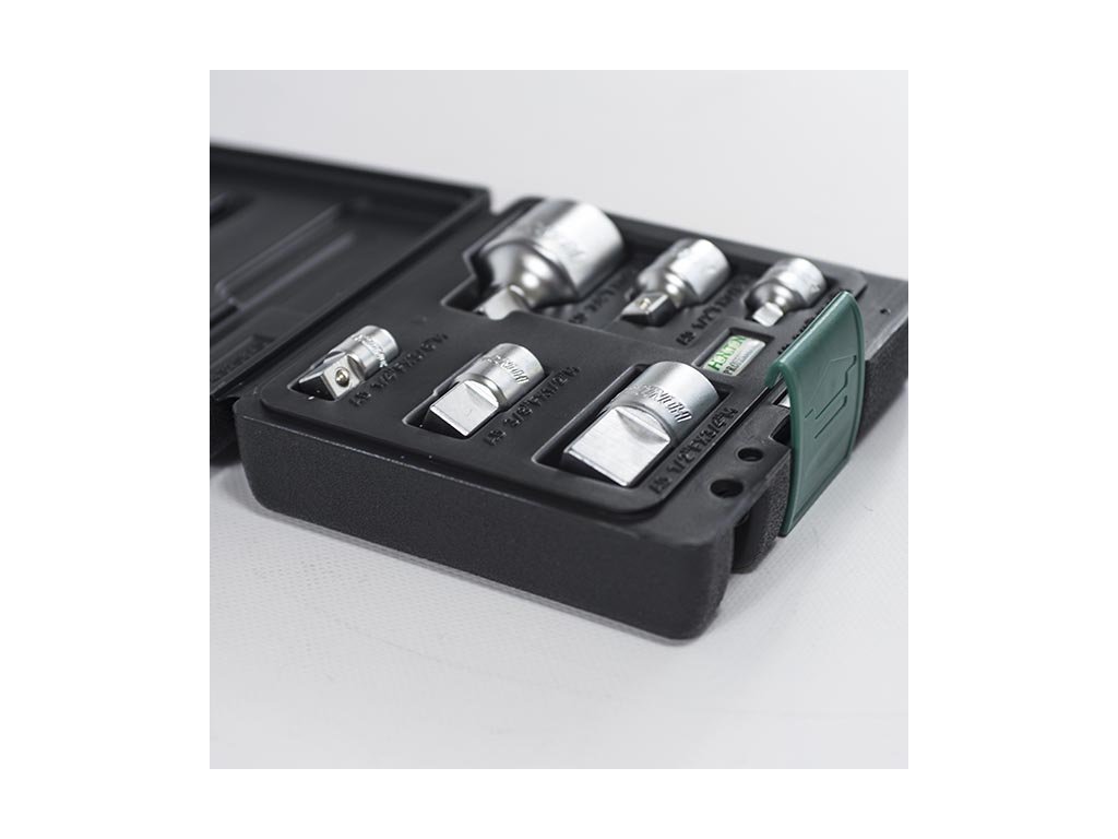 Profesionální sada redukcí obsahující 6 dílů, vhodná pro spojování hlavic a nástavců různých rozměrů: čtvrt, tři osminy, půl, tři čtvrtiny. Vyrobena z odolné oceli a uložena v praktickém plastovém boxu pro přehledné uspořádání a snadnou manipulaci.