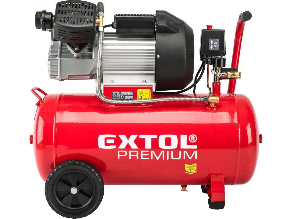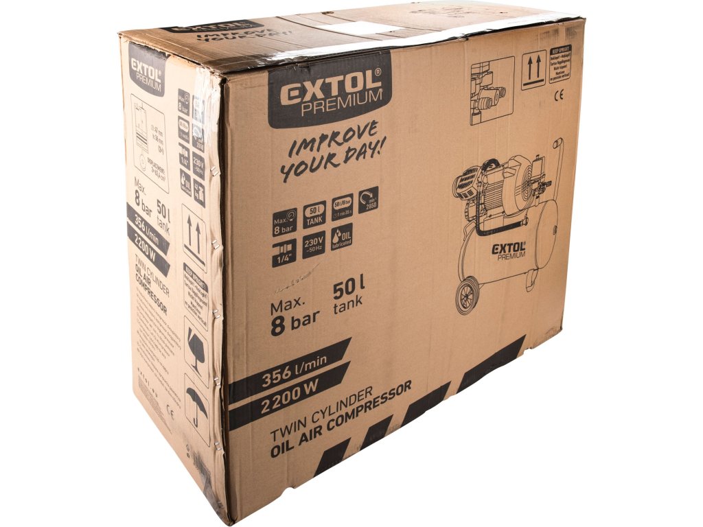 EXTOL Premium kompresor olejový 2200 W, 50 l (8895320) je výkonný dvoupístový olejový vzduchový kompresor určený pro široké spektrum aplikací v domácích dílnách, garážích i menších profesionálních provozech. Díky silnému motoru s příkonem 2200 W a objemu tlakové nádoby 50 l poskytuje dostatečnou zásobu stlačeného vzduchu pro delší provoz bez častého spínání motoru. Maximální tlak 8 bar a vysoký sací výkon až 356 l/min umožňují spolehlivou práci s pneumatickým nářadím i při náročnějších úlohách.