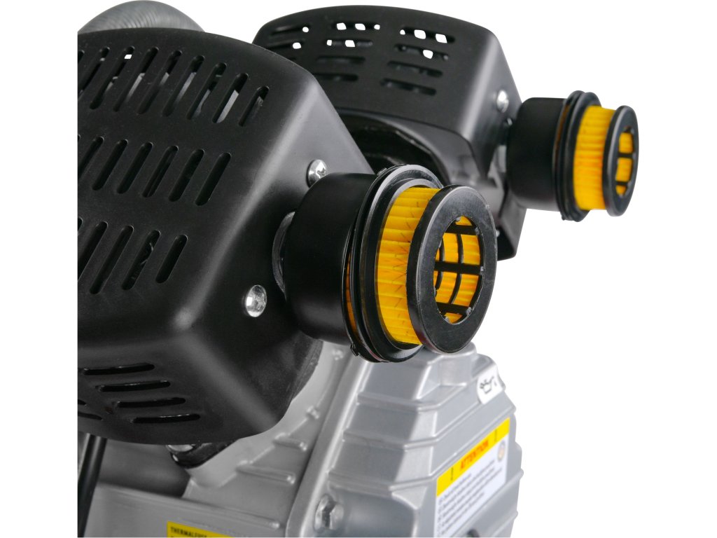 Kompresor je vybaven dvěma manometry – jeden pro tlak v nádrži a druhý pro výstupní tlak, což umožňuje přesné nastavení pracovního tlaku přes regulační ventil. Robustní kovový vzduchový filtr zajišťuje ochranu motoru a prodlužuje životnost zařízení. Ventil pro vypouštění kondenzátu usnadňuje údržbu a zvyšuje spolehlivost provozu.