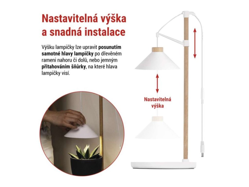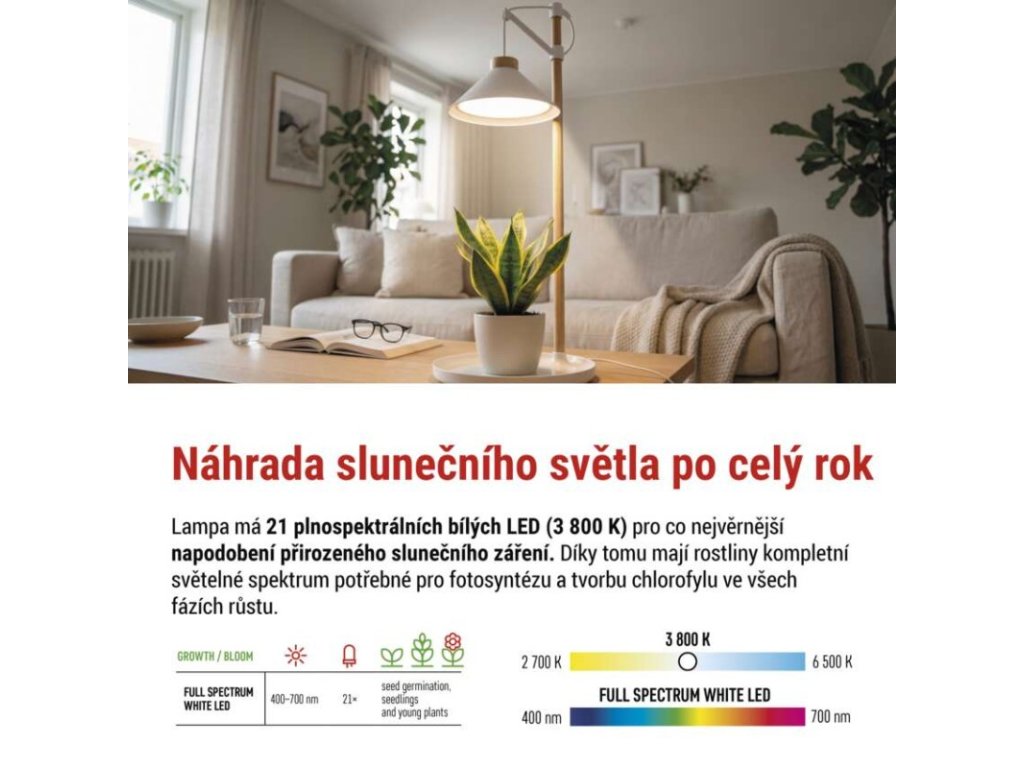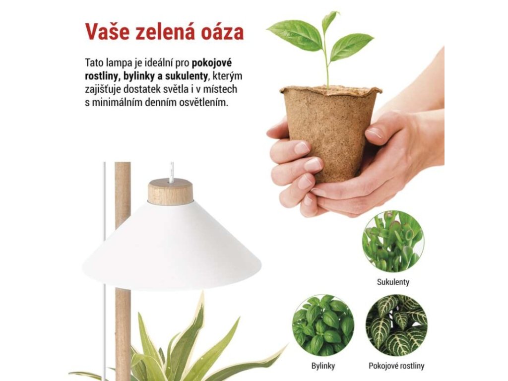 Použité plnospektrální bílé LED světlo napodobuje přirozené denní světlo a podporuje základní růstové procesy rostlin, zejména fotosyntézu a zdravý vývoj listové hmoty. Díky tomu je lampa vhodná pro dlouhodobé používání při pěstování pokojových rostlin, bylinek, klíčících semen i mladých sazenic.