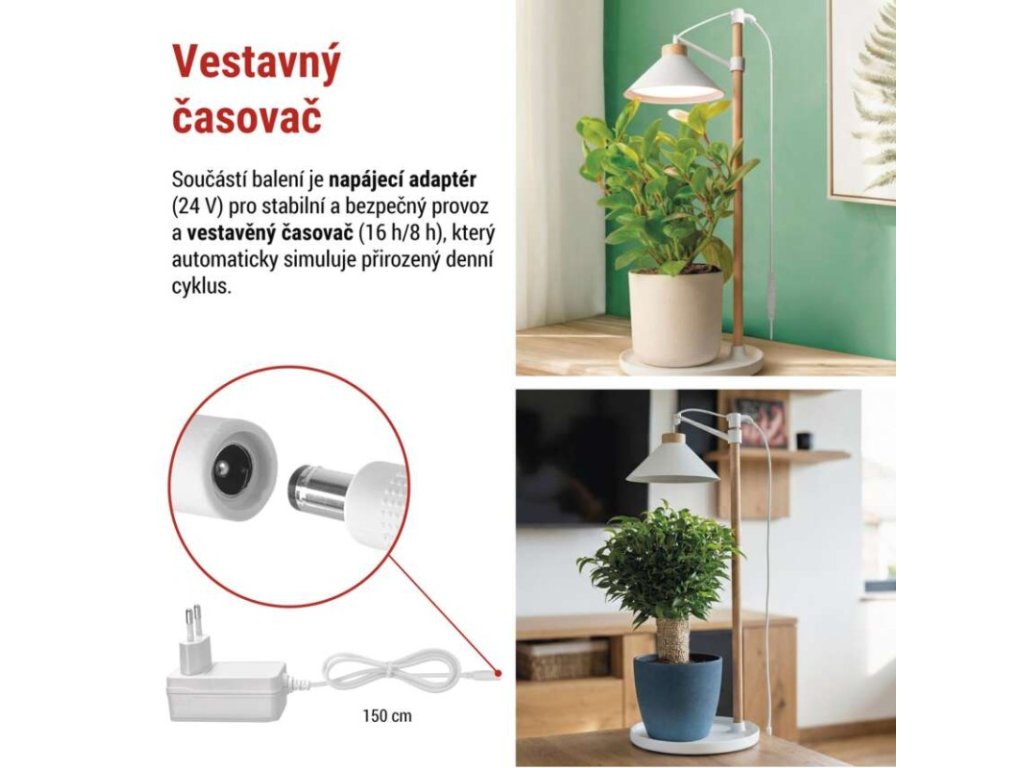 Významnou funkční výbavou lampy je integrovaný časovač, který umožňuje nastavit pravidelný světelný cyklus bez nutnosti každodenní manuální obsluhy. Rostliny tak mají zajištěn stabilní a opakující se režim osvětlení, což přispívá k rovnoměrnému růstu a dlouhodobé kondici. Automatický provoz je praktický také při delší nepřítomnosti uživatele.