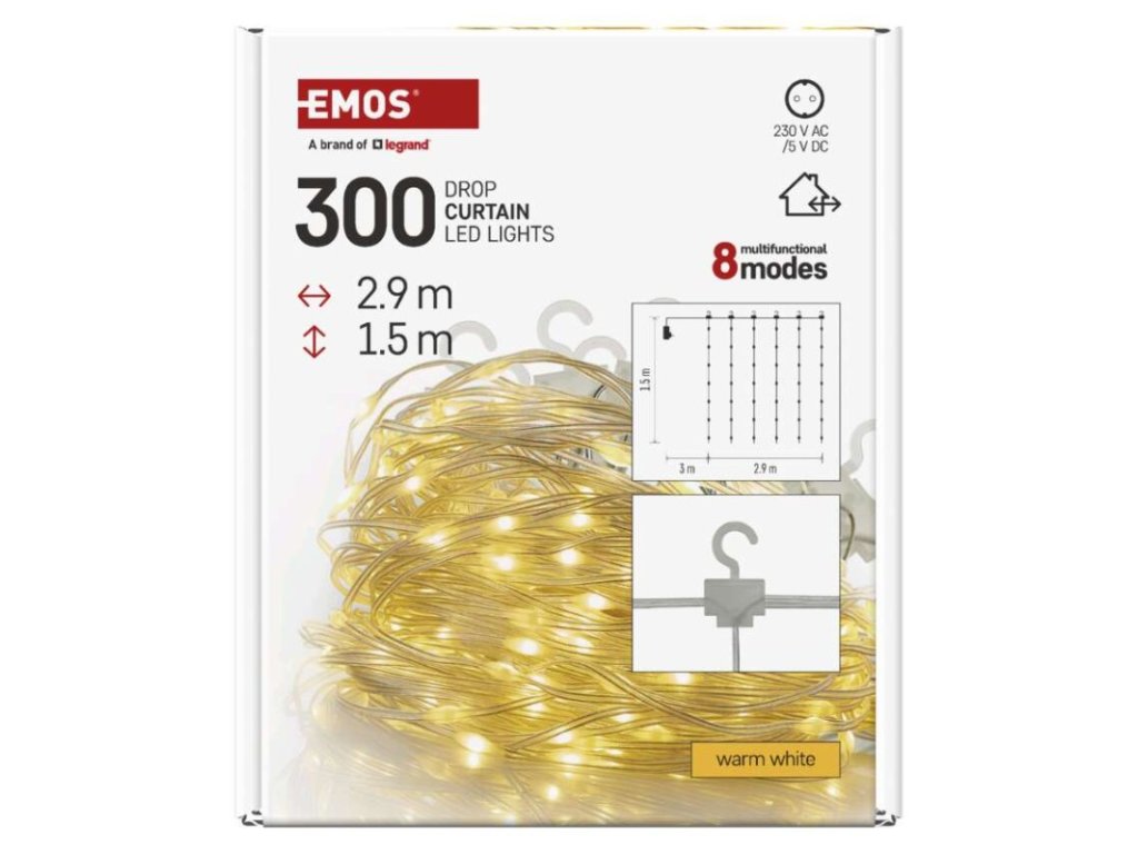 LED vánoční drop řetěz – záclona, 2,9x1,5 m, venkovní i vnitřní, teplá bílá, programy