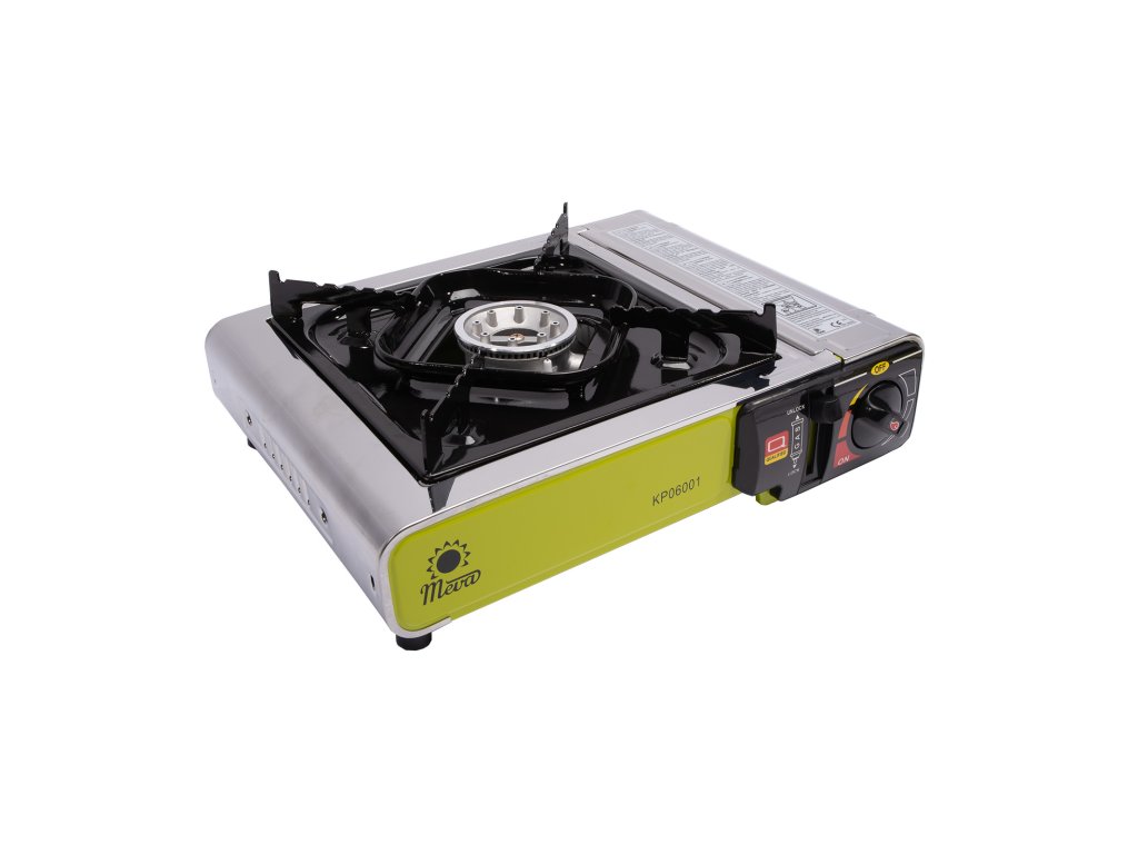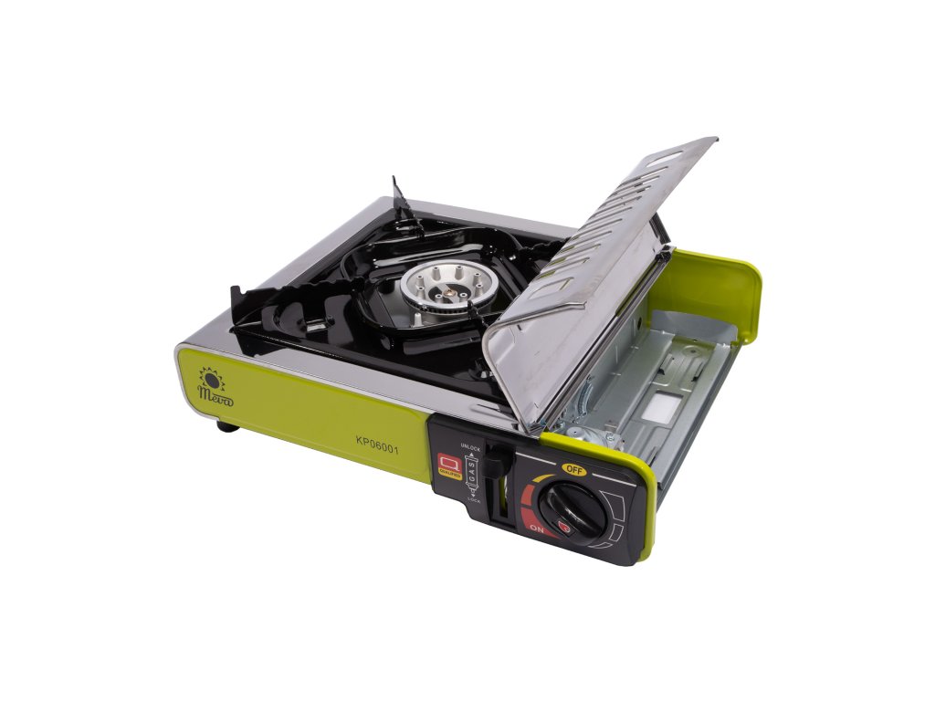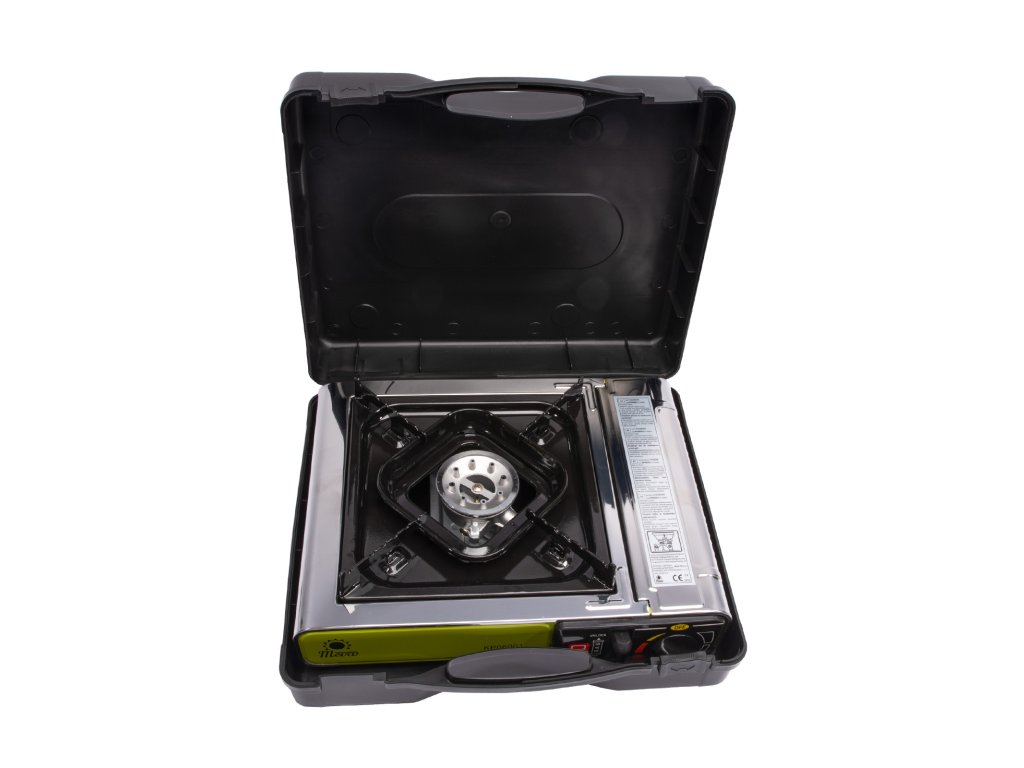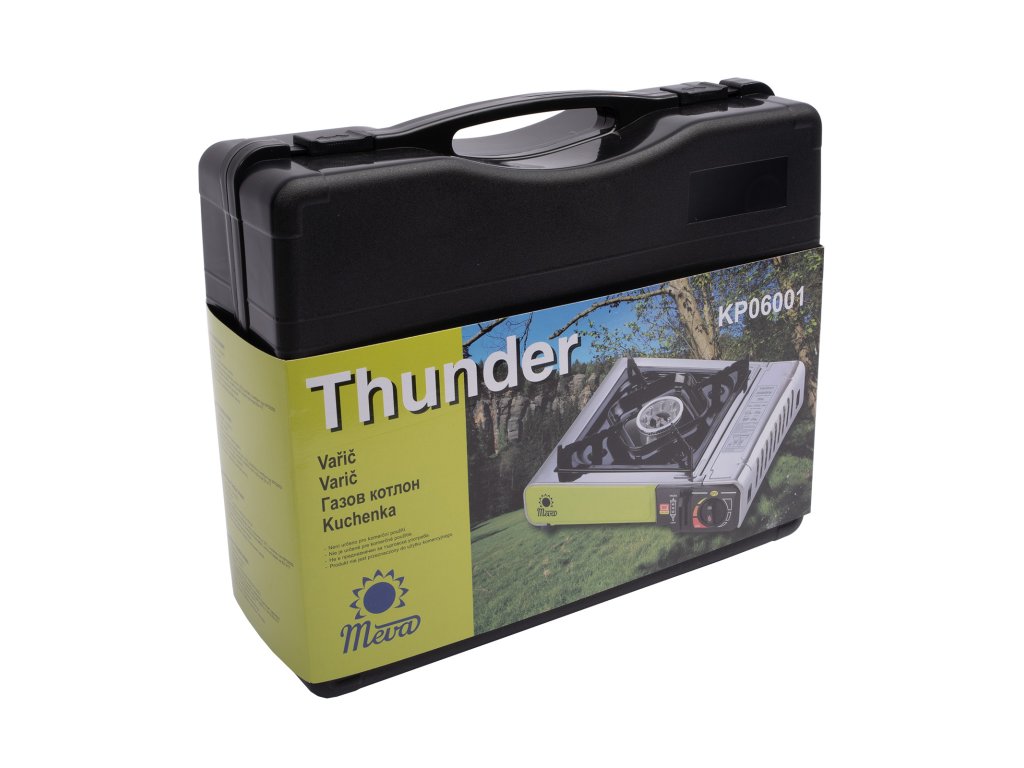 Přenosný vařič Meva Thunder určený pro venkovní použiti v praktickém plastovém kufříku pro snadný transport a ochranu vařiče před poškozením. Zavětrovací deska je vyrobena z nerezavějící oceli, což zajišťuje její dlouholetou životnost a zároveň je vařič velmi snadný na údržbu. Je vybaven pojistkou proti přehřátí kartuše, která v případě zvýšení teploty kartuše nad bezpečnou mez automaticky kartuši odpojí od systému. Ovládací knoflík je vybaven aretací v nulové poloze, což zabraňuje úniku plynu způsobenému neopatrnou manipulací. Určeno k připojení na ventilovou kartuši 227 g.