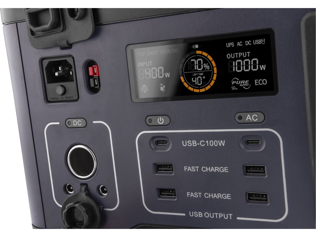 - Solární konektivita: Integrovaný MPPT regulátor a vstup pro panely o výkonu až 400 W pro úplnou energetickou nezávislost.