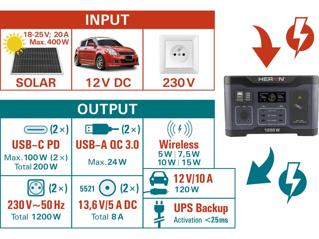 Nabíjecí stanice HERON 8896801 představuje tichou, ekologickou a bezúdržbovou alternativu k palivovým generátorům. Absence emisí a hlučnosti ji dovoluje používat v uzavřených prostorech, kancelářích nebo v těsné blízkosti lůžka během kempování. Součástí balení je kompletní sada kabeláže pro všechny typy napájení (síť, auto, solár), což z ní dělá produkt připravený k okamžitému nasazení. Tato stanice je ideálním nástrojem pro profesionály i outdoorové nadšence, kteří vyžadují nekompromisní výkon a širokou škálu funkcí v jednom přenosném zařízení.