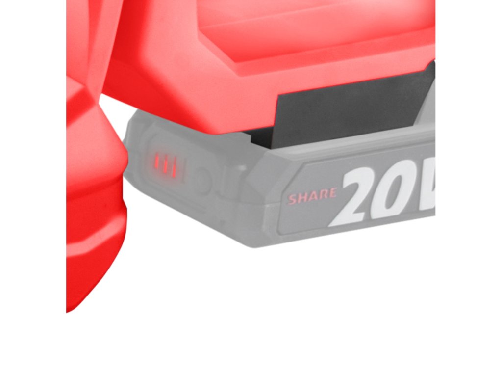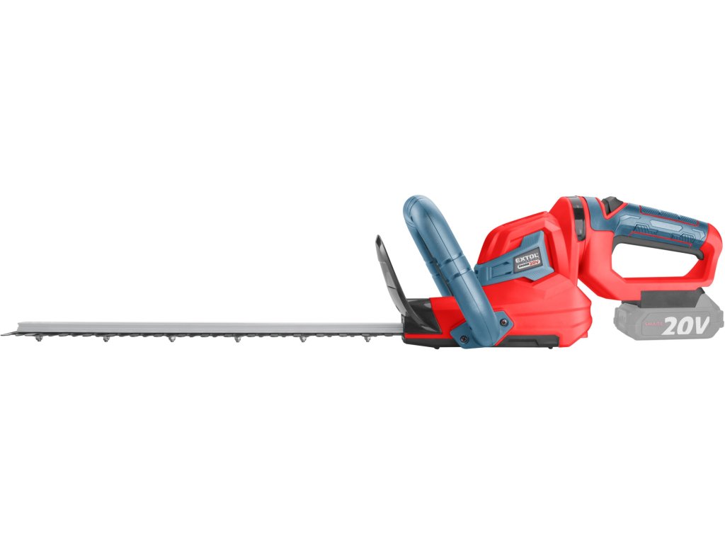Aku nůžky jsou určeny ke stříhání živého plotu až se středně silnými větvičkami v domácích zahradách. Maximální průměr střihaných větví je 16mm. Ostrá stříhací čepel si snadno poradí s živým plotem a je osazena hliníkovou lištou, která ji chrání před poškozením. Tuto čepel lze otáčet až o 90˚ což usnadňuje stříhání ve vertikální i horizontální poloze. Proti odletujícím kouskům větví je uživatel chráněn pevným plastovým krytem. Stroj je vybaven bezpečnostní pojistkou, která se aktivuje při vyklouznutí z rukou a elektronickou doběhovou brzdou, která zajistí jeho rychlé zastavení. Pogumovaná rukojeť brání vysmeknutí, tlumí vibrace a zpříjemňuje držení při práci. Nůžky jsou navrženy tak, aby byly lehké a ergonomické. Mají dobře vyváženou konstrukci, která snižuje namáhání rukou a zad při delší práci. Díky napájení z baterie již není nutné dávat pozor na napájecí kabel a manipulace s nimi je pohodlnější. Také nikoho nebude rušit hlukem, který vydávají benzínové modely. Aku nůžky nevyžadují složitou péči. Stačí je pravidelně čistit, udržovat ostří čepele a kontrolovat stav baterie. Pro běžnou práci dostačují jeden nebo dva 2Ah akumulátory, které můžete rychle nabít v rychlonabíječce, pro náročnější nebo delší práci doporučujeme větší akumulátory s kapacitou 4–8Ah. Akumulátor má indikátor nabití a lze použít ve všech typech nářadí řady EXTOL SHARE20V. Díky použité Li-ion technologii je ho možné kdykoliv dobíjet, aniž by se tím snižovala jeho kapacita. Li-ion akumulátor ztrácí energii vlivem samovybíjení velmi pomalu a vydrží dlouho nabitý a připravený k použití.