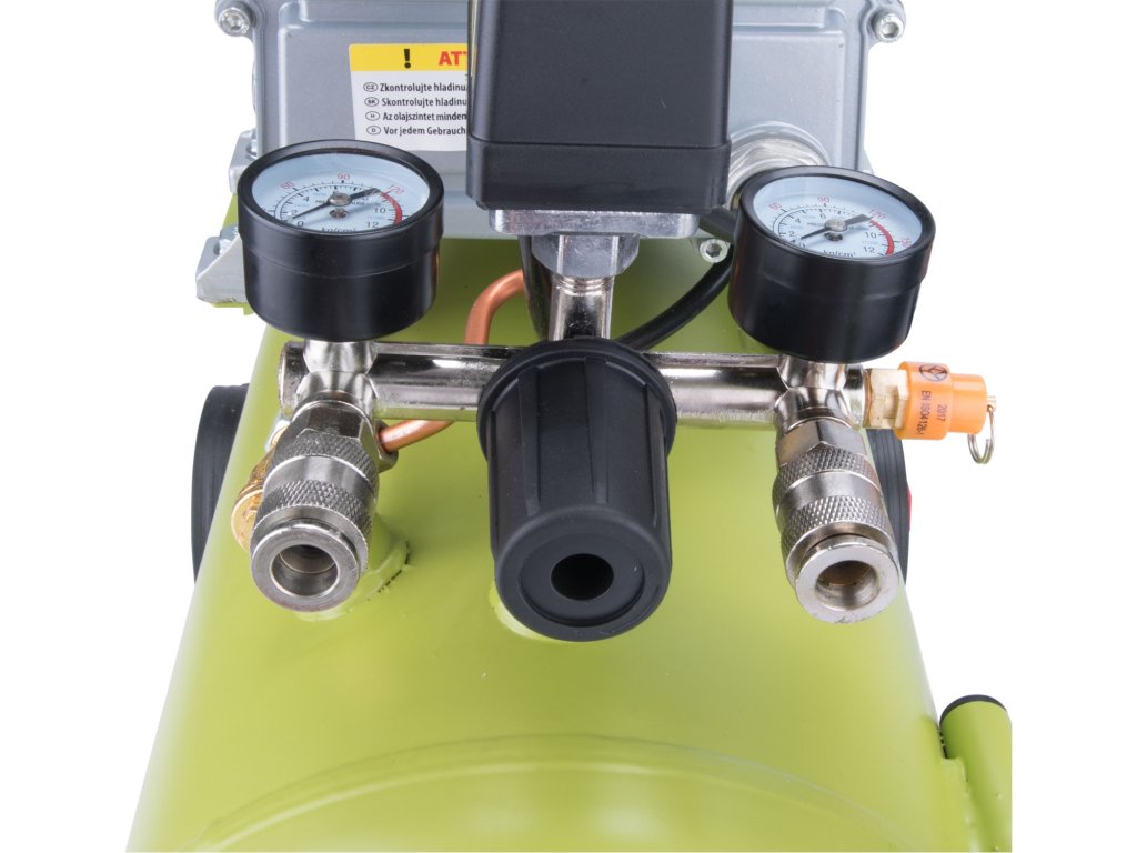 Díky sacímu výkonu až 154 l/min a plnícímu výkonu 100 l/min poskytuje dostatečný průtok vzduchu pro většinu hobby aplikací. Kompresor je vybaven dvěma manometry — jeden pro tlak v nádrži a druhý pro nastavený výstupní tlak přes regulační ventil, což umožňuje přesné řízení pracovního tlaku podle potřeby.