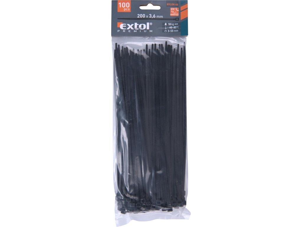 pásky stahovací na kabely černé, 200x3,6mm, 100ks, nylon PA66