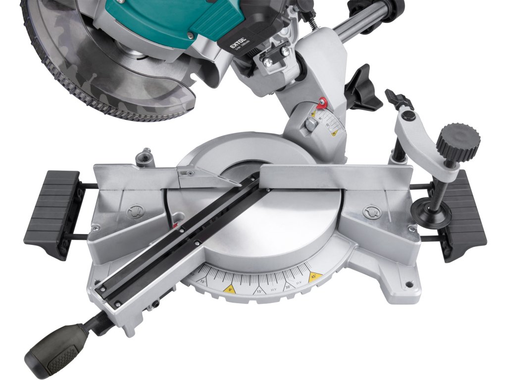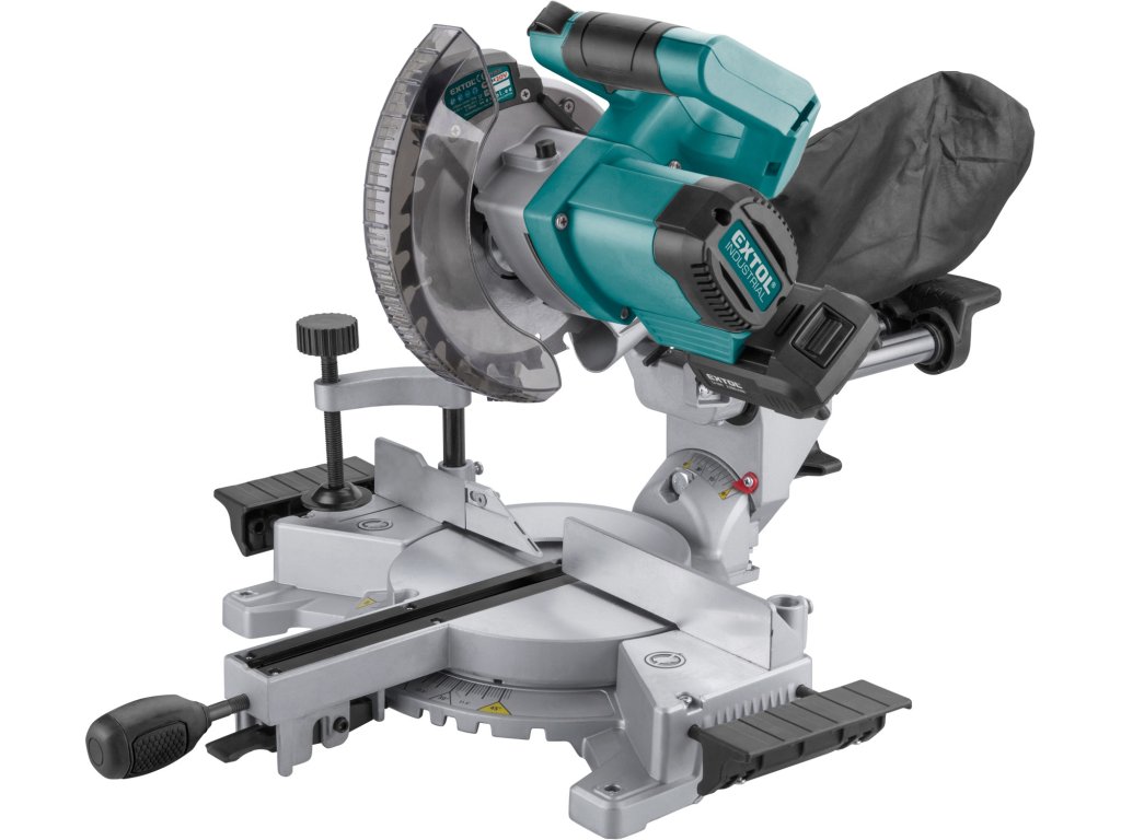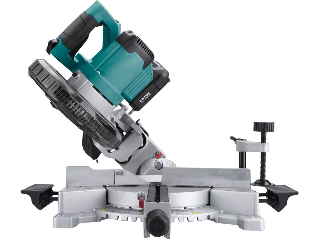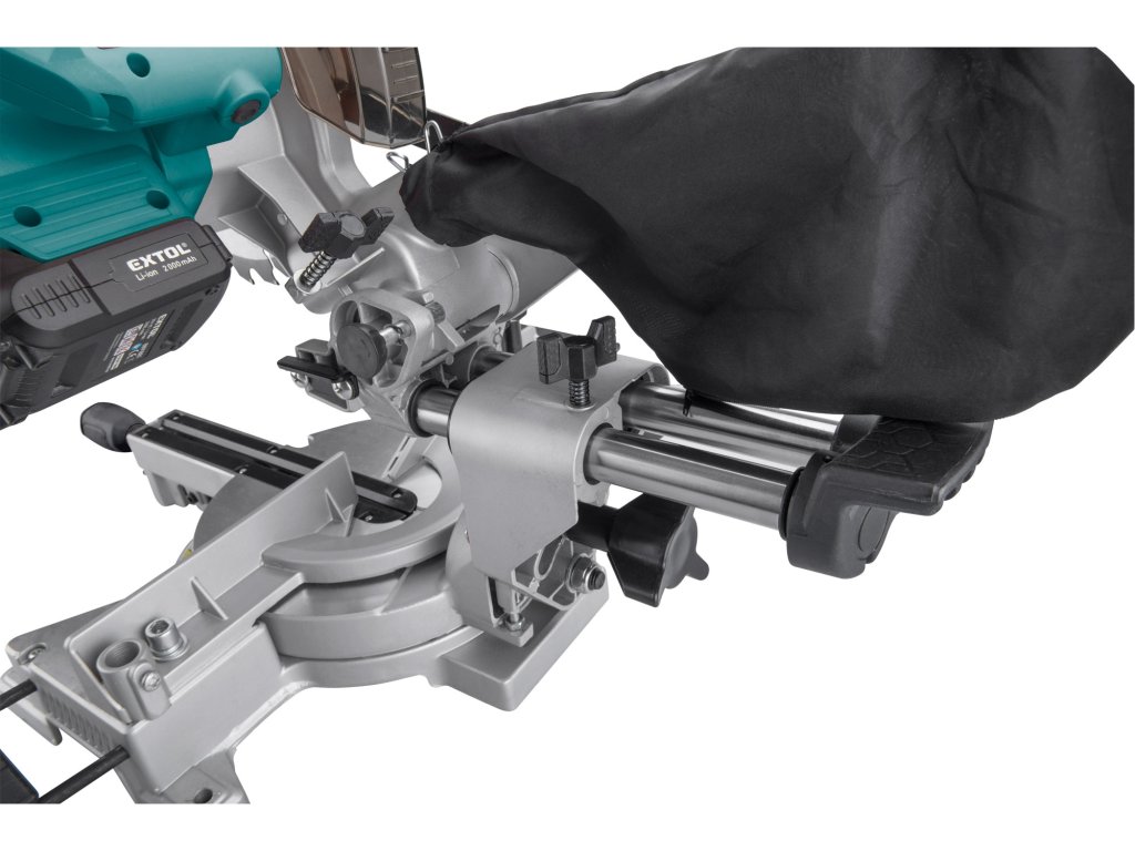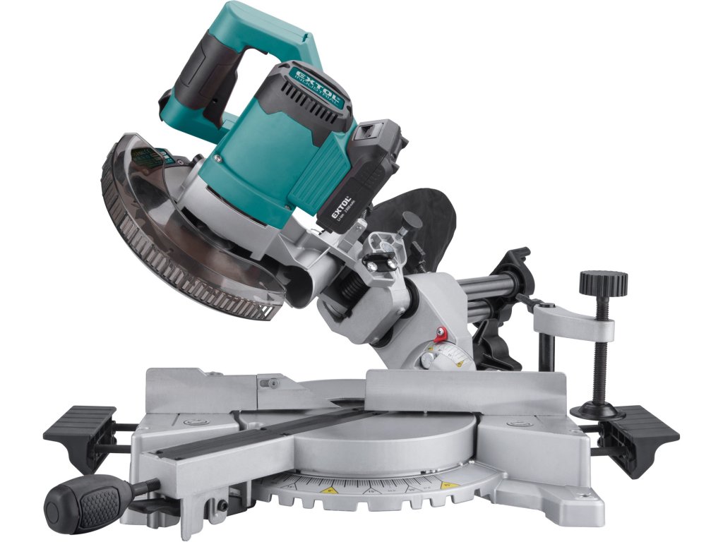 Aku pokosová a kapovací pila s laserem je určena k provádění přesných příčných a podélných řezů dřeva používaného pro stavební účely, dřevovláknitých a dřevotřískových desek, dále tenké umělé hmoty, hliníkových profilů a tenkých měkkých neželezných materiálů s použitím k tomu určených pilových kotoučů. Pila je poháněná nejmodernějším „brushless" motorem s 3300 ot./min, který umožňuje uživatelům rychle a snadno řezat materiálem. Tento nový typ motoru má vyšší životnost, je výkonnější a má menší spotřebu el. energie než klasické motory s uhlíkovými kartáči. Masivní základna pily je vyrobena z hliníku. Pro pohodlnou práci je pila vybavena laserem, výsuvnými opěrkami pro delší materiály a svěrkou pomocí které si můžete upnout materiál na pracovní plochu. Pro zvýšení bezpečnosti práce má pila el. brzdu, která zastaví pilový kotouč ihned po vypnutí. Součástí pily je výstup pro zachytávání pilin do přiloženého pytlíku nebo pro připojení k odsávacímu systému. 2000mAh baterie stačí až na 110 řezů hranolu 50×50mm. Pro běžnou práci dostačují jeden nebo dva 2000mAh akumulátory, které můžete rychle nabít v rychlonabíječce, pro náročnější nebo delší práci doporučujeme větší akumulátory s kapacitou 4000–8000mAh, které také poskytují vyšší řezací výkon. Akumulátor lze použít ve všech typech nářadí řady EXTOL SHARE20V. Díky použité Li-ion technologii je ho možné kdykoliv dobíjet, aniž by se tím snižovala jeho kapacita. Li-ion akumulátor ztrácí energii vlivem samovybíjení velmi pomalu a vydrží dlouho nabitý a připravený k použití.