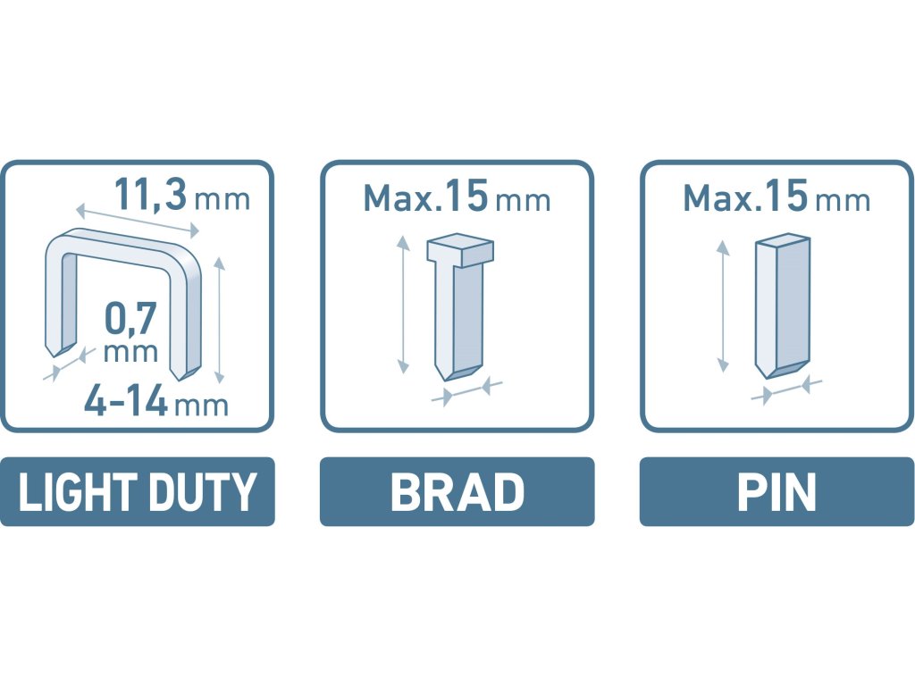 doplňující parametr | možnost nastavení síly úderu, vhodné pro spony: výška 4-14mm, rozteč 11,3x tl.0,75mm, hřebíky s hlavičkou i bez hlavičky do max. |