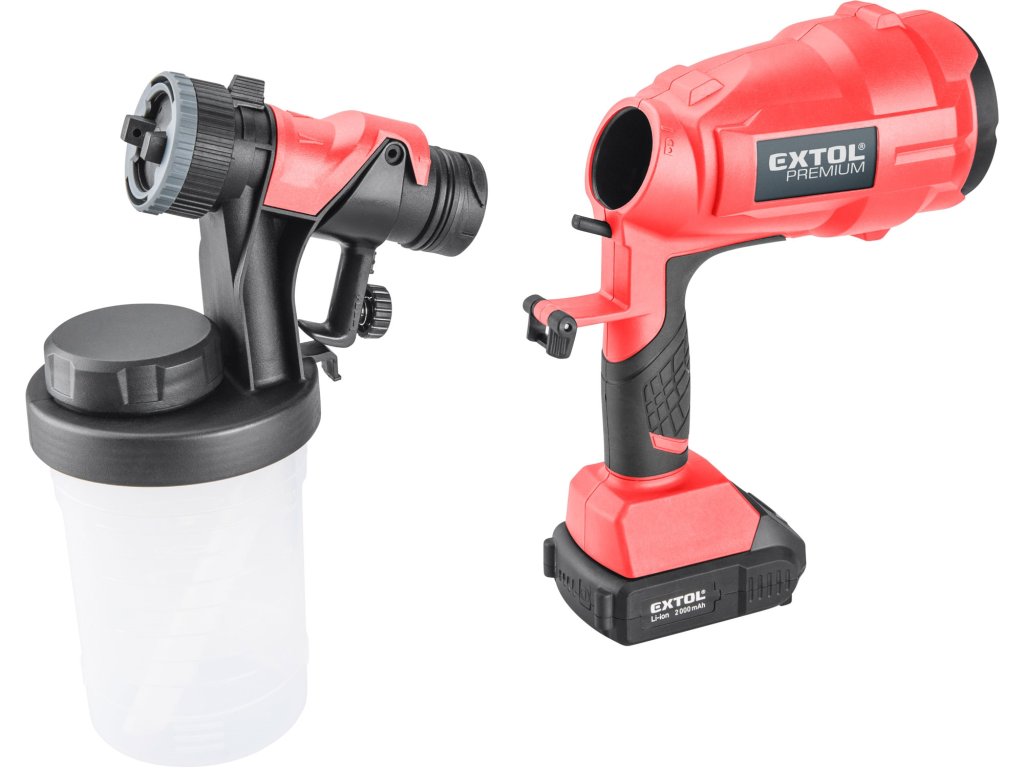 HVLP aku stříkací pistole je ideální pro stříkání barvy doma, na chalupě či v zahradě. Vyšší výkon jí dovoluje používat hustější typy barev nebo méně ředěné barvy, čímž je možno zrychlit práci. Stříkací pistole umožňuje regulovat množství nanášené barvy a má 3 tvary nanášejícího paprsku — horizontální a vertikální paprsek a kruh/bod. Lze použít pro nanášení těchto barev a tekutin: plastických a latexových barev, vodou ředitelných barev, základových a emailových barev, barev na bázi oleje nebo hliníku, krycích laků, uzavíracích nátěrů pro automobily nebo dřevo, mořidel, konzervantů na dřevo, prostředků na ochranu dřeva a rostlin, desinfekčních prostředků. Nádoba na barvu má objem 900ml a díky jejímu designu lze doplňovat barvu bez její demontáže. Pogumovaná rukojeť je příjemnější, lépe se drží a zmenšuje únavu při práci. Pro běžnou práci dostačují jeden nebo dva 2000mAh akumulátory, které můžete rychle nabít v rychlonabíječce, pro náročnější nebo delší práci doporučujeme větší akumulátory s kapacitou 4000–8000mAh. Akumulátor lze použít ve všech typech nářadí řady EXTOL SHARE20V. Díky použité Li-ion technologii je ho možné kdykoliv dobíjet, aniž by se tím snižovala jeho kapacita. Li-ion akumulátor ztrácí energii vlivem samovybíjení velmi pomalu a vydrží dlouho nabitý a připravený k použití.