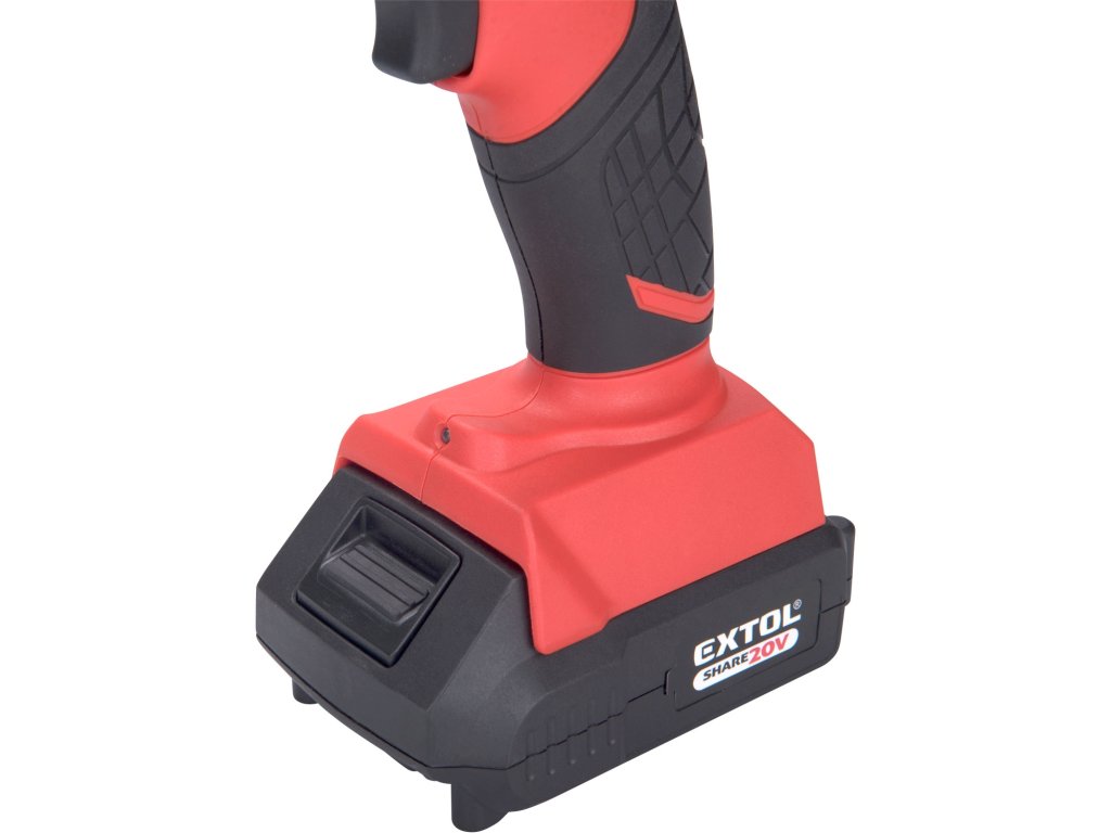 Aku vytlačovací vaničková pistole je určena k vytlačování silikonu, chemických kotev apod. z kartuší. Rychlost posuvu lze nastavit na 6polohovém regulátoru v rozsahu 50-560mm/min, což umožňuje přesnou regulaci toku hmoty. Silný motor a převody vyvinou tlak až 2000N tlačné síly. Pistole má funkci ANTI-DRIP, která po zastavení pistole automaticky popojede nazpátek a díky tomuto uvolnění tlaku v tubě, nepokračuje vytlačování hmoty. Pro zrychlení práce není zpětný chod motorizovaný, ale jen rychle povytáhnete píst. Vaničku je možno otočit v rozsahu 360°. Stroj je vybaven ochrannou proti přetížení. Rukojeť je pokryta měkkou protiskluzovou gumou, která snižuji vibrace a dobře se drží. Přímo nad baterií je umístěno osvětlení, které osvětluje pracovní místo. Pro běžnou práci dostačují jeden nebo dva 2000mAh akumulátory, které můžete rychle nabít v rychlonabíječce, pro náročnější nebo delší práci doporučujeme větší akumulátory s kapacitou 4000–8000mAh. Akumulátor lze použít ve všech typech nářadí řady EXTOL SHARE20V. Díky použité Li-ion technologii je ho možné kdykoliv dobíjet, aniž by se tím snižovala jeho kapacita. Li-ion akumulátor ztrácí energii vlivem samovybíjení velmi pomalu a vydrží dlouho nabitý a připravený k použití.