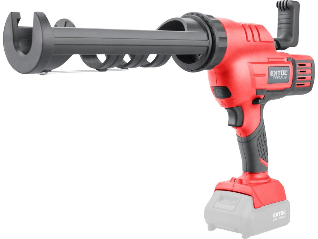 Aku vytlačovací vaničková pistole je určena k vytlačování silikonu, chemických kotev apod. z kartuší. Rychlost posuvu lze nastavit na 6polohovém regulátoru v rozsahu 50-560mm/min, což umožňuje přesnou regulaci toku hmoty. Silný motor a převody vyvinou tlak až 2000N tlačné síly. Pistole má funkci ANTI-DRIP, která po zastavení pistole automaticky popojede nazpátek a díky tomuto uvolnění tlaku v tubě, nepokračuje vytlačování hmoty. Pro zrychlení práce není zpětný chod motorizovaný, ale jen rychle povytáhnete píst. Vaničku je možno otočit v rozsahu 360°. Stroj je vybaven ochrannou proti přetížení. Rukojeť je pokryta měkkou protiskluzovou gumou, která snižuji vibrace a dobře se drží. Přímo nad baterií je umístěno osvětlení, které osvětluje pracovní místo. Pro běžnou práci dostačují jeden nebo dva 2000mAh akumulátory, které můžete rychle nabít v rychlonabíječce, pro náročnější nebo delší práci doporučujeme větší akumulátory s kapacitou 4000–8000mAh. Akumulátor lze použít ve všech typech nářadí řady EXTOL SHARE20V. Díky použité Li-ion technologii je ho možné kdykoliv dobíjet, aniž by se tím snižovala jeho kapacita. Li-ion akumulátor ztrácí energii vlivem samovybíjení velmi pomalu a vydrží dlouho nabitý a připravený k použití.