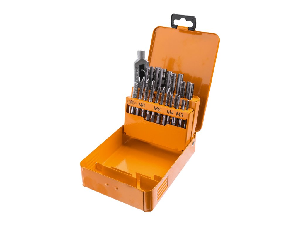 Kompaktní sada závitníků v praktickém kovovém boxu. Ideální pro řezání vnitřních závitů v kovových materiálech.