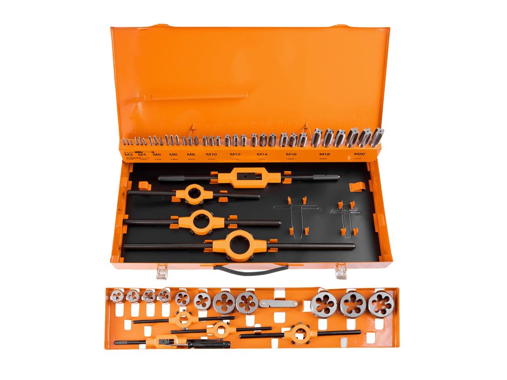 Kompletní závitovací sada vhodná pro opravy, údržbu i profesionální dílenské použití. Obsahuje metrické závitníky a závitová očka v široké škále rozměrů, včetně příslušenství.